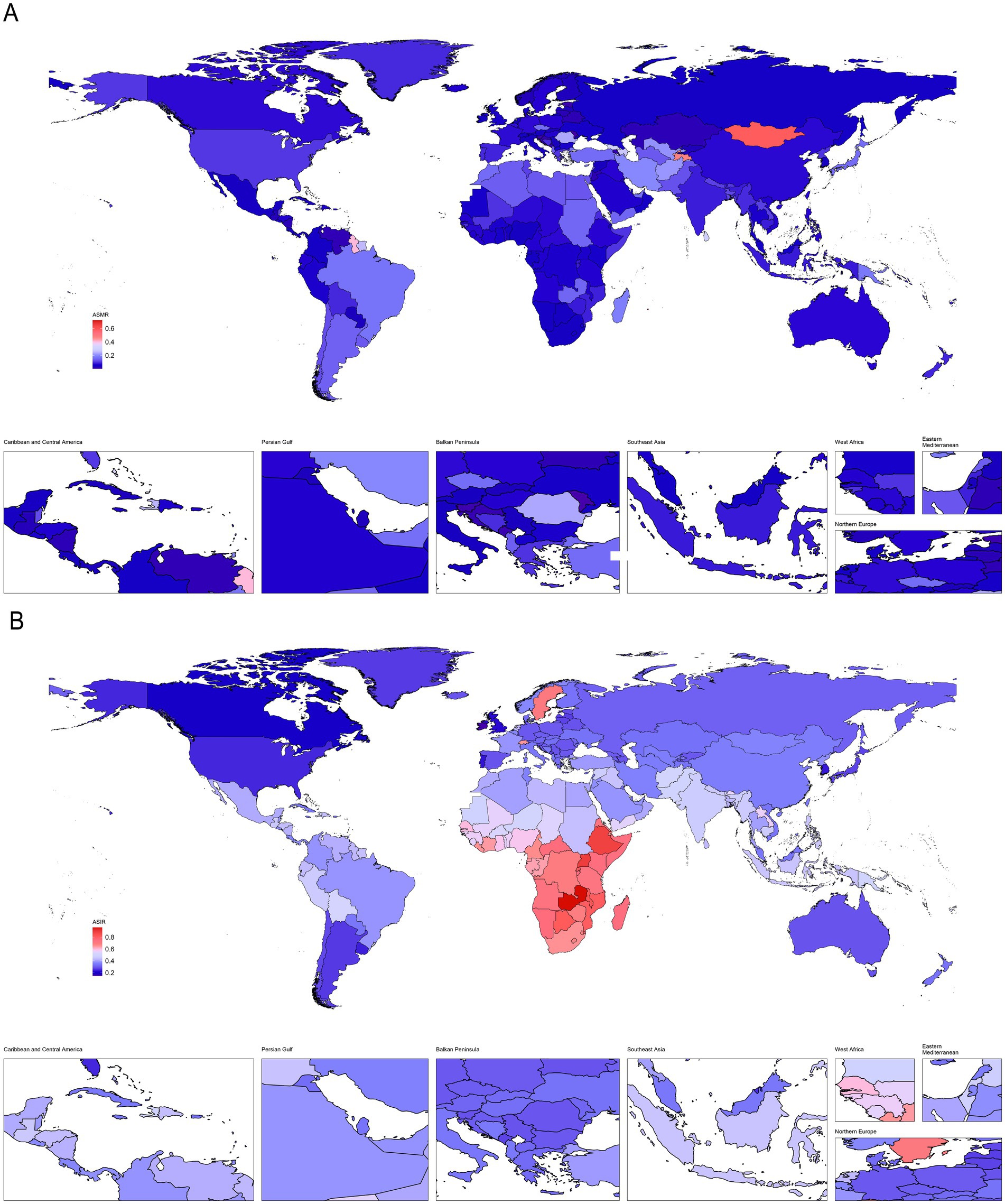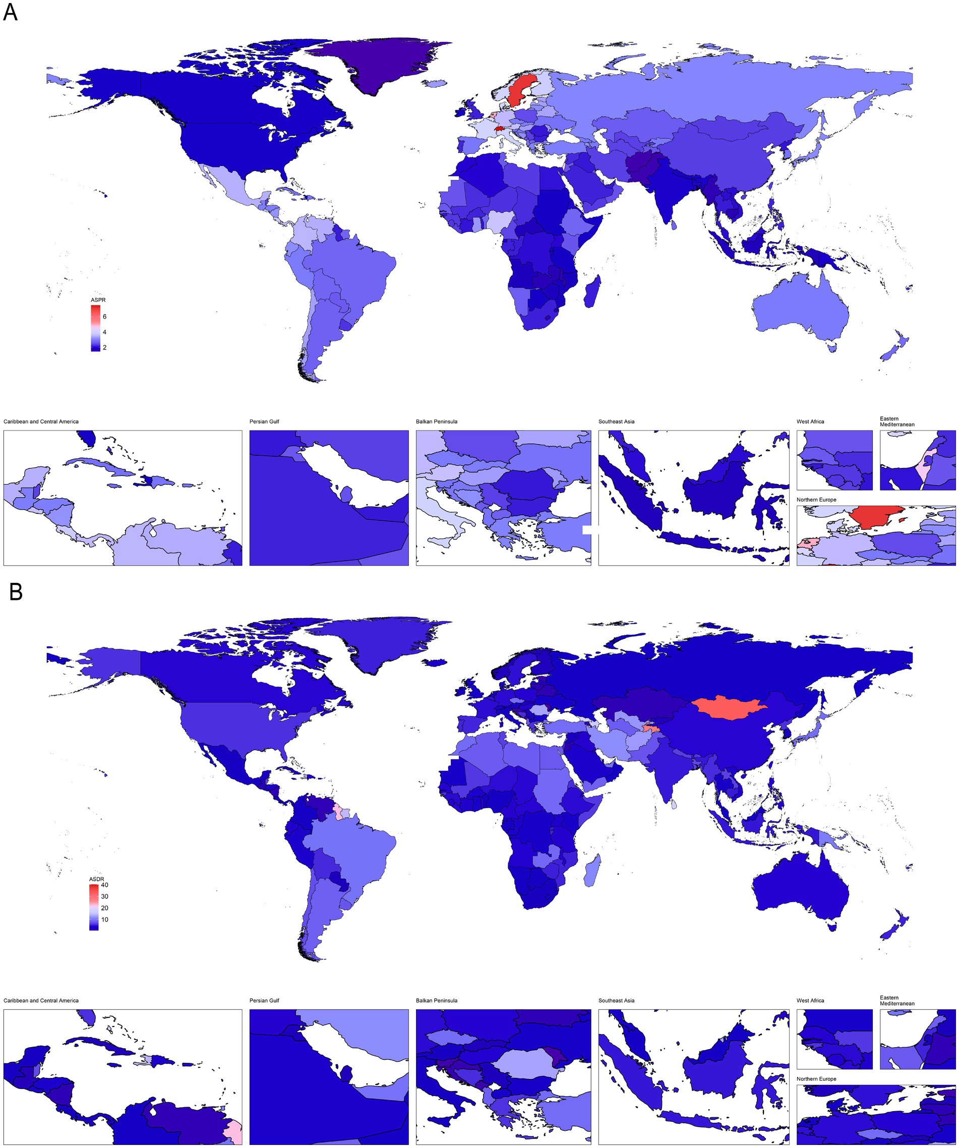 Figure 1. Descriptive analysis of PAH burden at national levels. (A) The ASR of deaths in 2021; (B) The ASR of incidence in 2021.