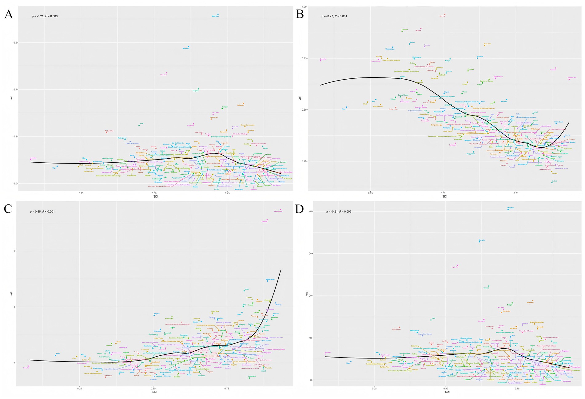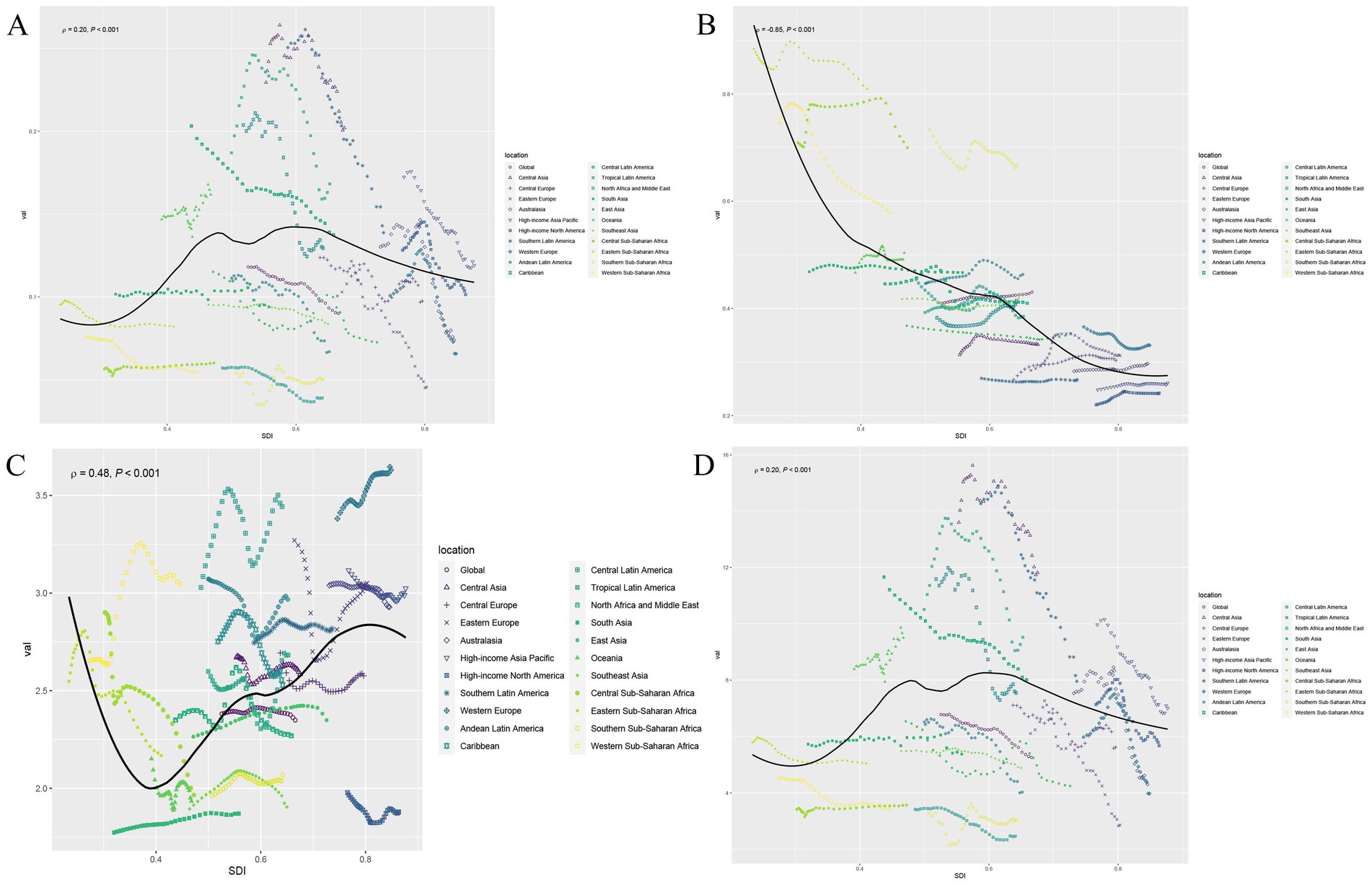 Figure 4. The relationship between the social demographic index (SDI) and the ASR of deaths, incidence, prevalence, and DALYs in different countries. (A) Deaths. (B) Incidence. (C) Prevalence. (D) DALYs. The ρ value and p value in the upper left corner of each subgraph represent the correlation coefficient and the statistical significance of the relationship, respectively.