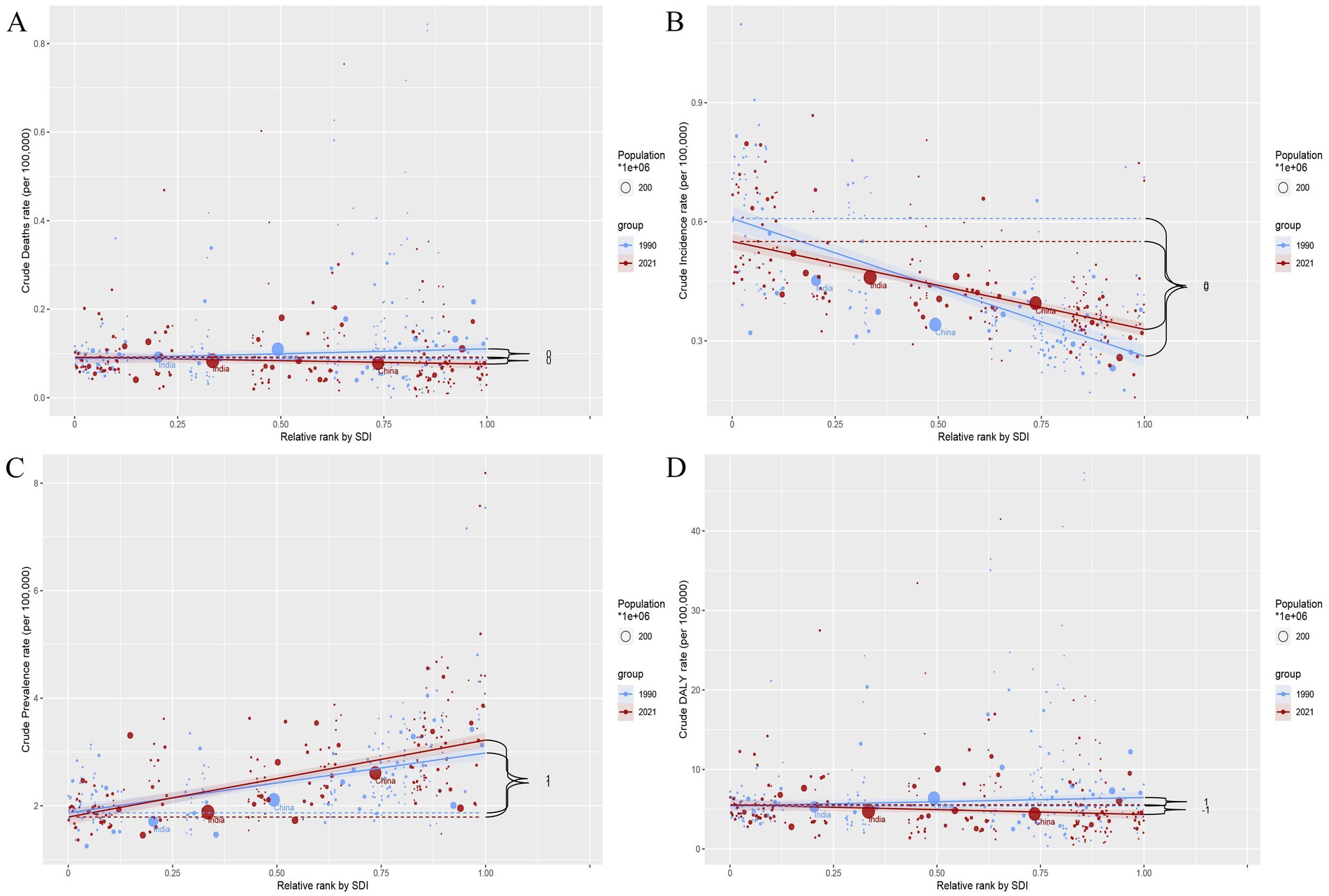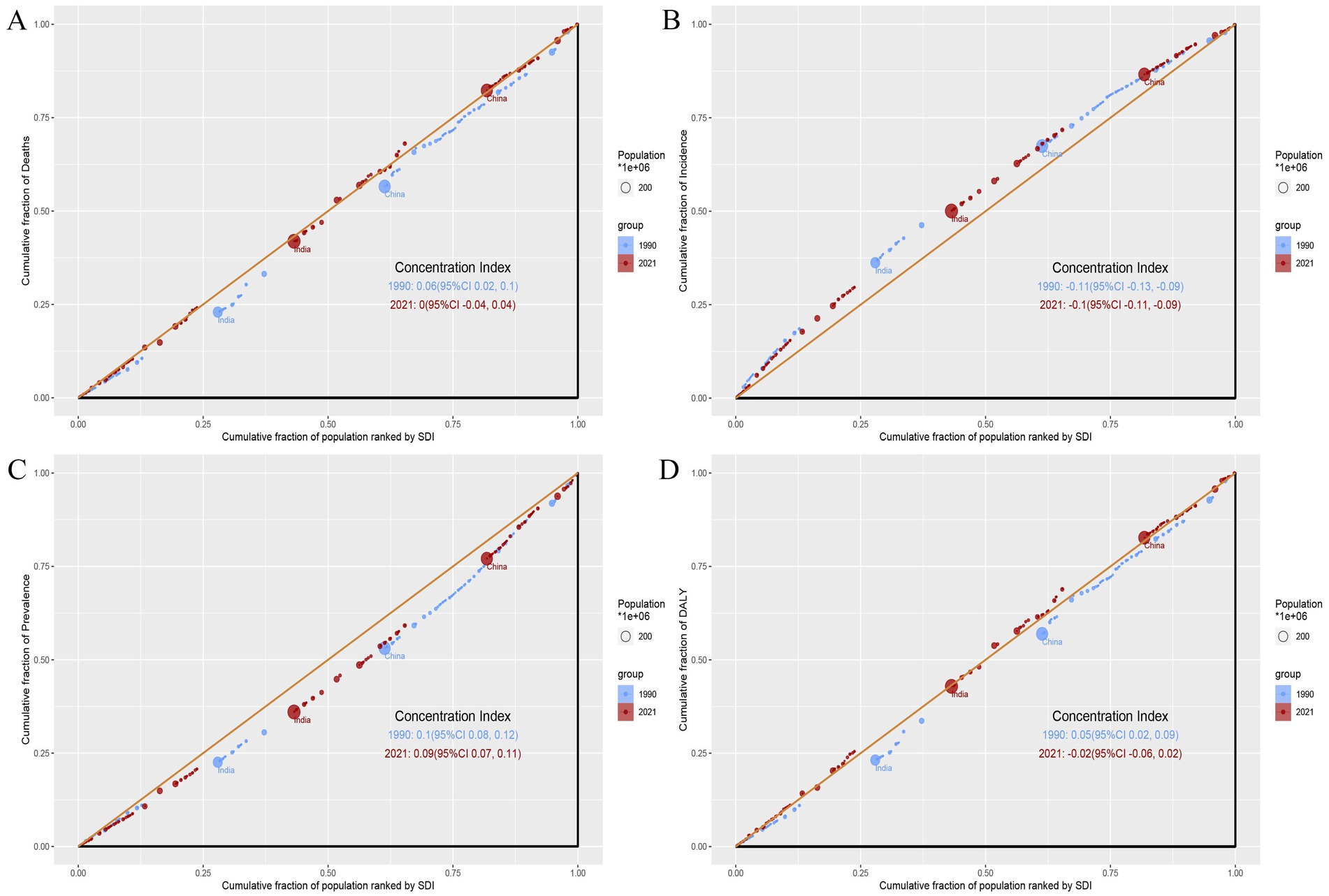 Figure 6. Concentration index (CI) for deaths, incidence, prevalence, and DALYs by SDI in 1990 and 2021. (A) Deaths. (B) Incidence. (C) Prevalence. (D) DALYs. Blue dots and lines represent data from 1990, while red dots and lines represent data from 2021. Larger circles indicate data for populations of 1 million or more.