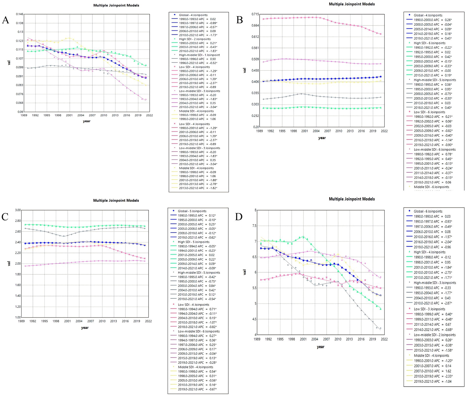 Figure 7. Joinpoint regression analysis on the ASR of deaths, DALYs, prevalence, and incidence with PAH in global and 5 SDI regions. (A) Deaths. (B) Incidence. (C)Prevalence. (D) DALYs.