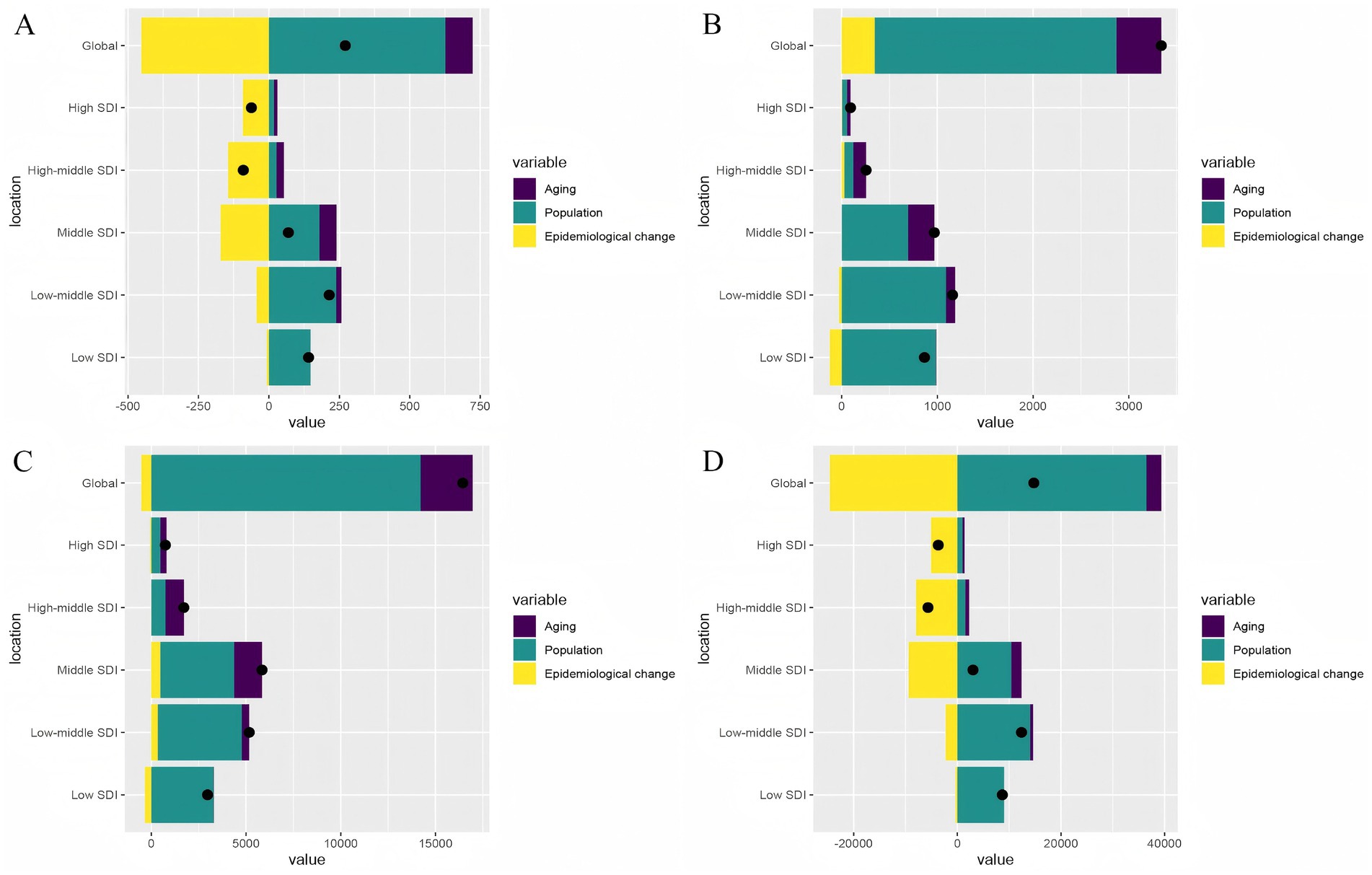 Figure 8. Decomposition analysis on the ASR of deaths, DALYs, prevalence, and incidence with PAH in global and 5 SDI regions. (A) Deaths. (B) Incidence. (C)Prevalence. (D) DALYs.