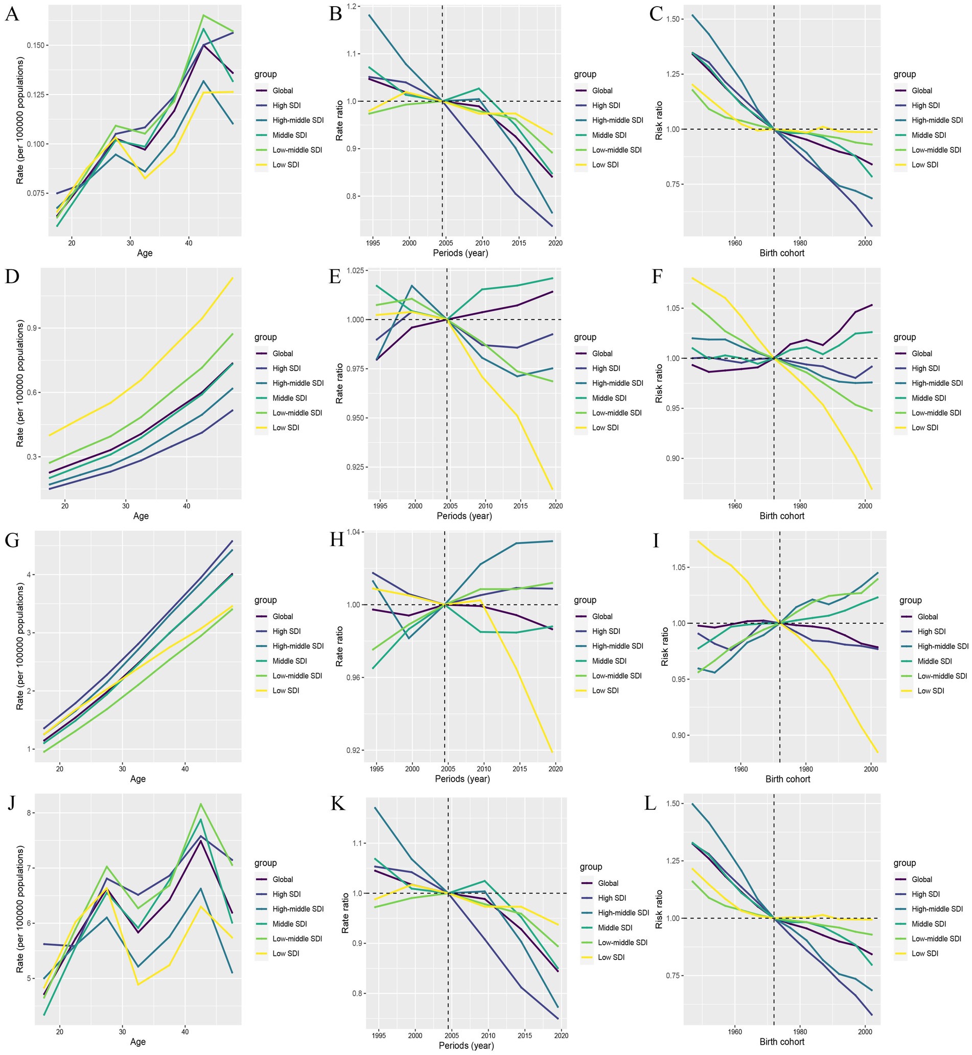 Figure 9. The impact of age, period, and birth cohort on PAH burden among WCBA, based on the age-period-cohort (APC) model. (A–C) Deaths. (D–F) Incidence. (G–I) Prevalence. (J–L) DALYs.