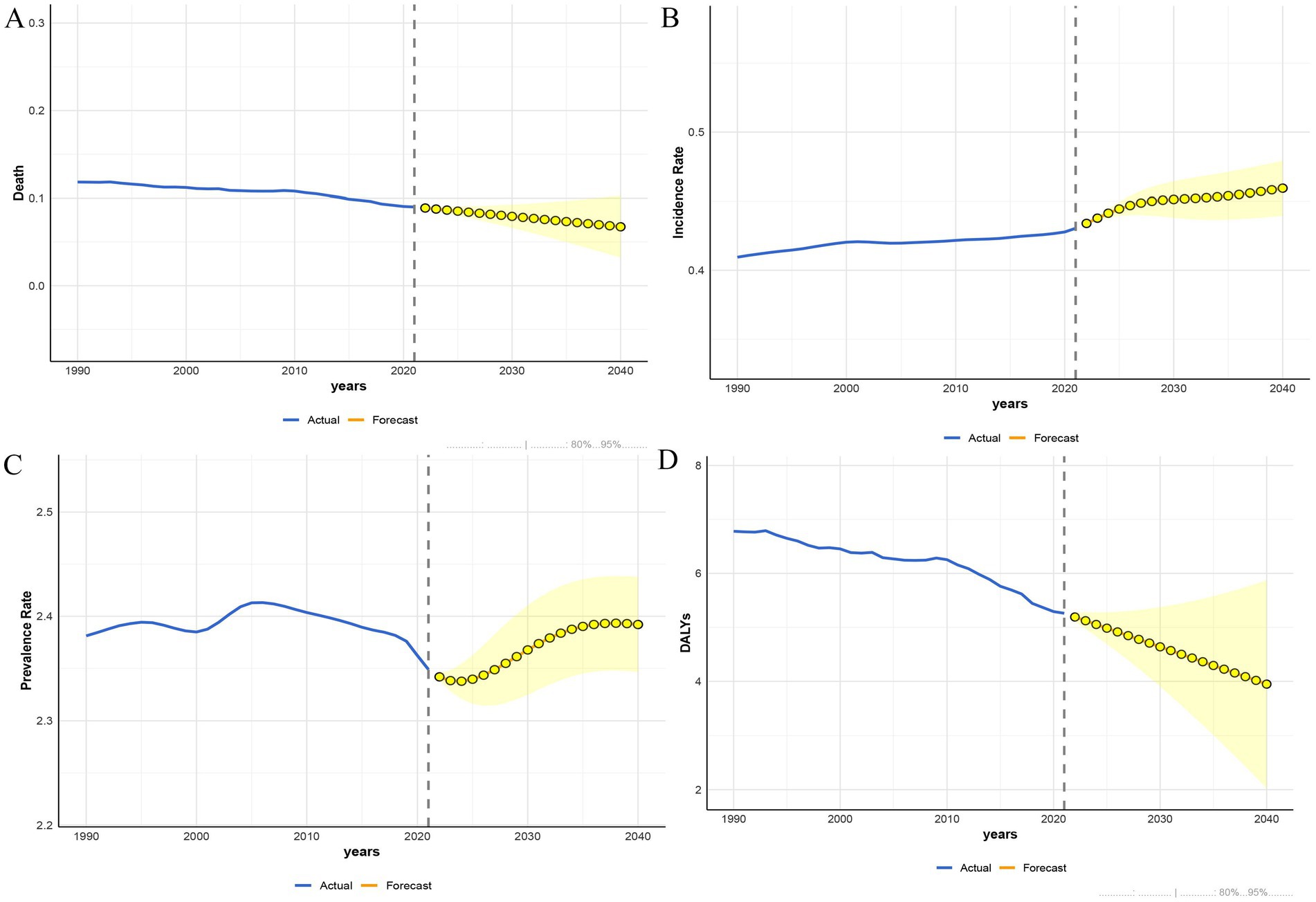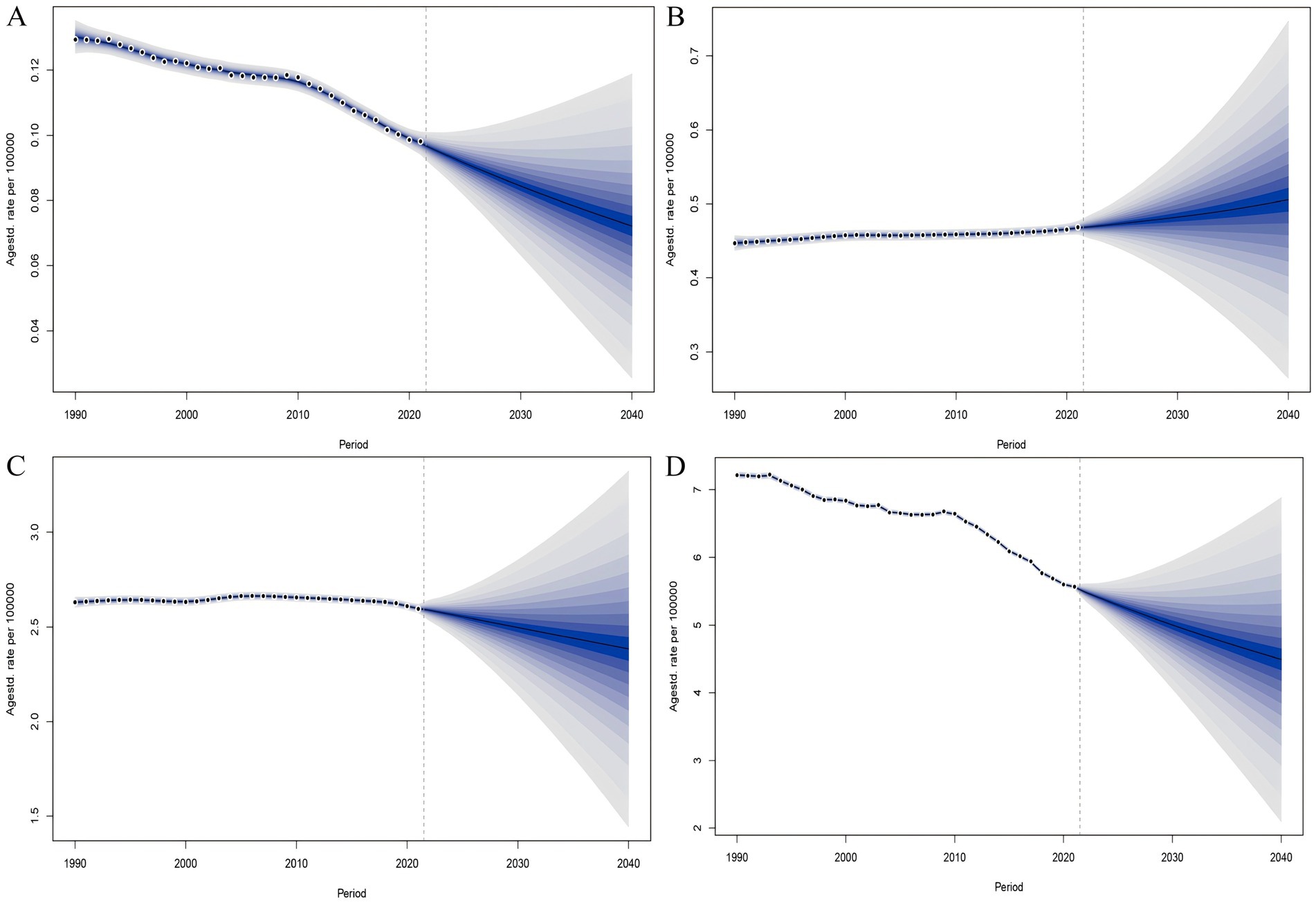 Figure 10. The BAPC model predicted the disease burden of PAH in the WCBA from 2022 to 2040. (A) Deaths. (B) Incidence. (C) Prevalence. (D) DALYs.