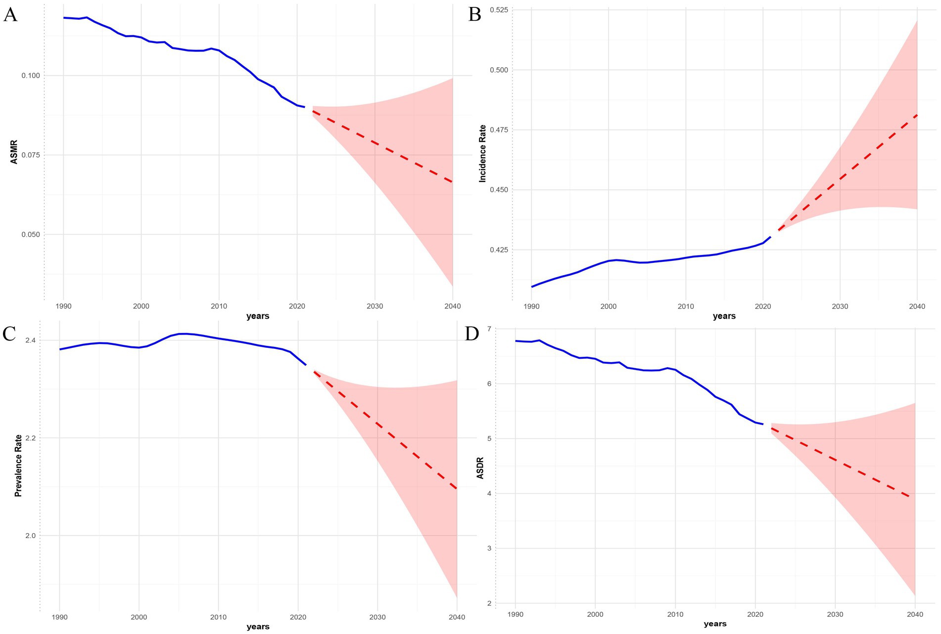 Figure 12. The ETS model predicted the disease burden of PAH in the WCBA from 2022 to 2040. (A) Deaths. (B) Incidence. (C) Prevalence. (D) DALYs.