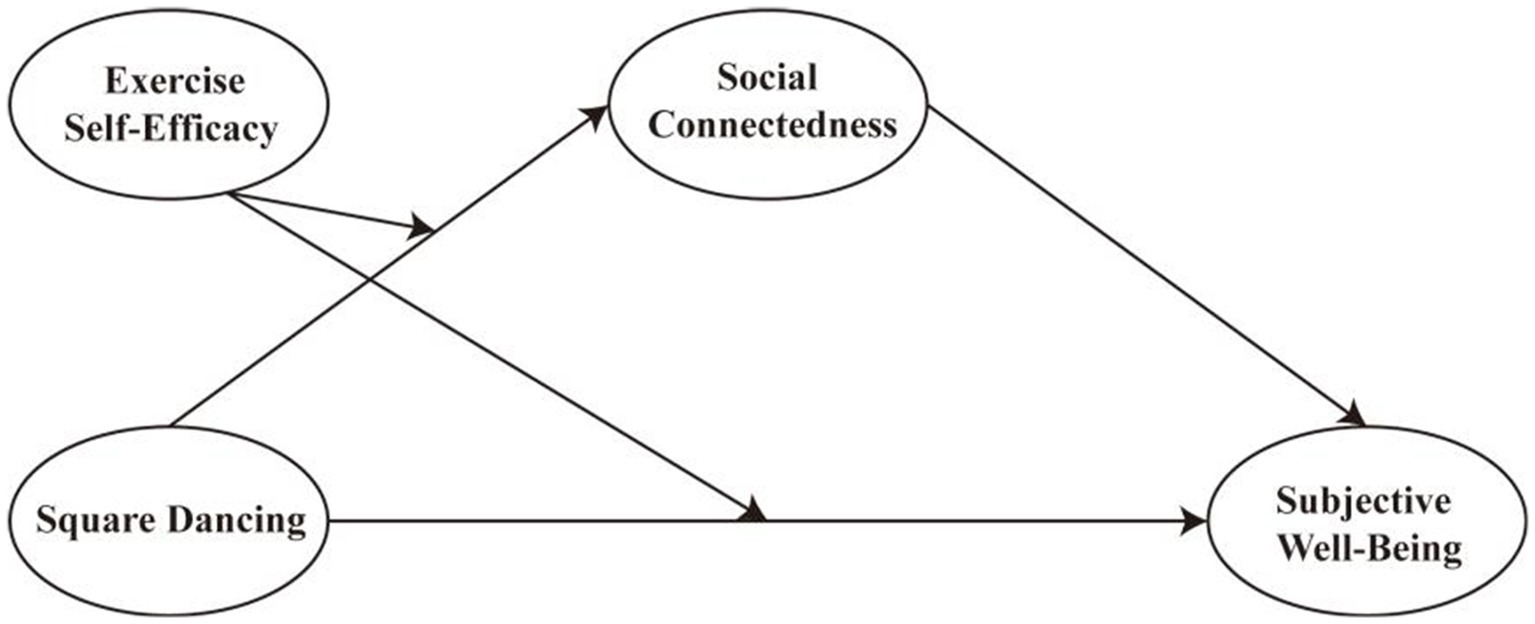In response to this research gap, the present study develops a moderated mediation framework to examine how participation in square dancing influences subjective well-being through social connectedness and exercise self-efficacy. Although previous studies have explored the health benefits of physical activity, few have specifically investigated the social and psychological mechanisms through which square dancing, as a community-based group exercise, promotes well-being among middle-aged and older women. This study aims to address this gap and enrich evidence on the psychosocial pathways linking physical activity to well-being.