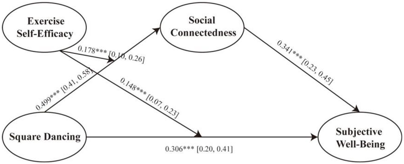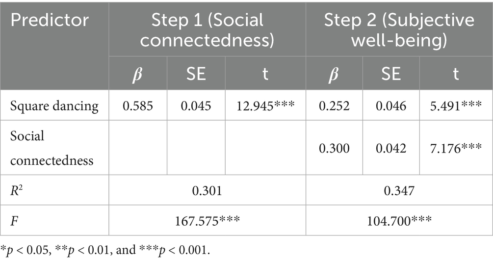As shown in Table 5, square dancing significantly positively predicted social connectedness (β = 0.585, p < 0.001). In the subsequent regression, square dancing (β = 0.252, p < 0.001) and social connectedness (β = 0.300, p < 0.001) both significantly and positively predicted subjective well-being, indicating the presence of potential mediating effects.
