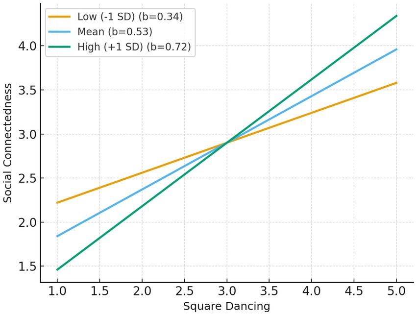In addition, the conditional indirect effects of square dancing on subjective well-being through social connectedness were examined at different levels of exercise self-efficacy (Table 8). The results indicated that the indirect effect was significant across all levels of exercise self-efficacy, but increased progressively from low [−1 SD, b = 0.094, 95% CI (0.049, 0.142)] to mean [b = 0.145, 95% CI (0.097, 0.195)] and high levels [+1 SD, b = 0.197, 95% CI (0.134, 0.260)]. This pattern further suggests that individuals with higher exercise self-efficacy not only experienced stronger direct effects of square dancing on well-being but also benefited more from the social connectedness pathway.