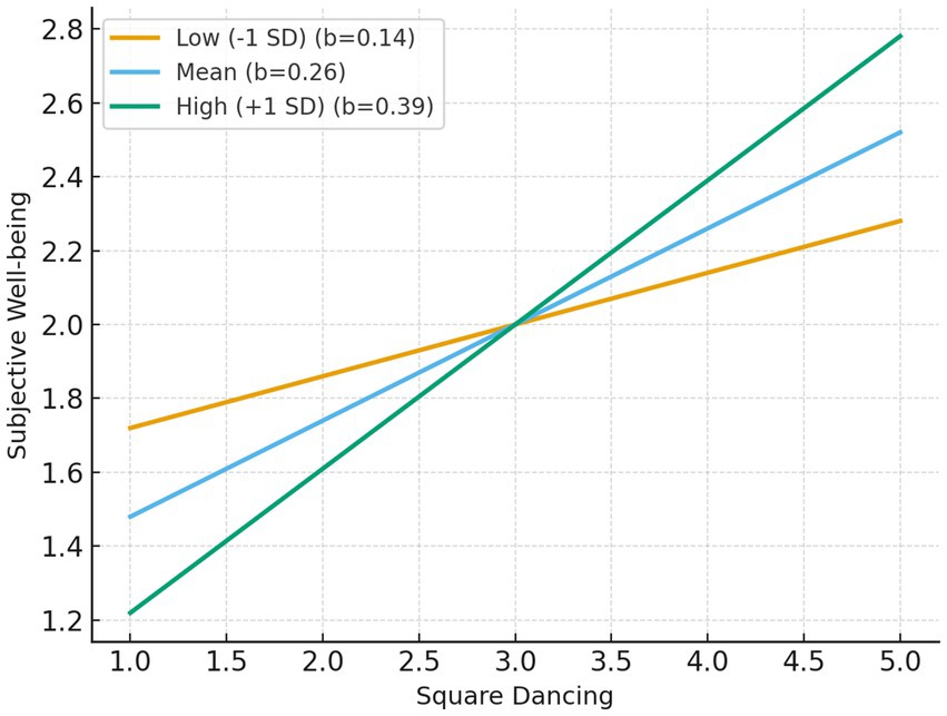 Similarly, when subjective well-being served as the dependent variable, the positive effect of square dancing also strengthened as self-efficacy increased: b = 0.14 [p = 0.015, 95% CI (0.03, 0.25)] at low (−1 SD), b = 0.26 [p < 0.001, 95% CI (0.18, 0.35)] at mean, and b = 0.39 [p < 0.001, 95% CI (0.27, 0.50)] at high (+1 SD) levels. The Johnson–Neyman significance region began at −1.19, indicating that the moderating effect was significant.