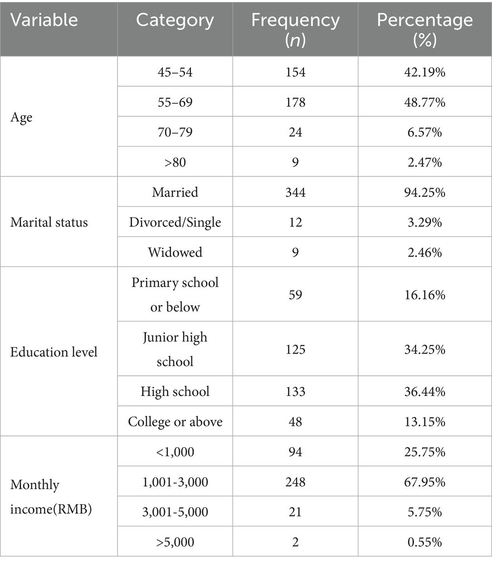 As shown in Table 1, a total of 365 valid participants were included in this study. The majority were aged between 45 and 69 years (90.96%), and most were married (94.25%). In terms of education, 16.16% had primary school or below, while the largest groups had junior high school (34.25%) or high school education (36.44%), and 13.15% had college or above. Monthly income was mainly concentrated between RMB 1,001 and 3,000 (67.95%). Overall, the sample was characterized by middle-aged and older women with stable marital status, moderate education levels, and low-to-middle income.