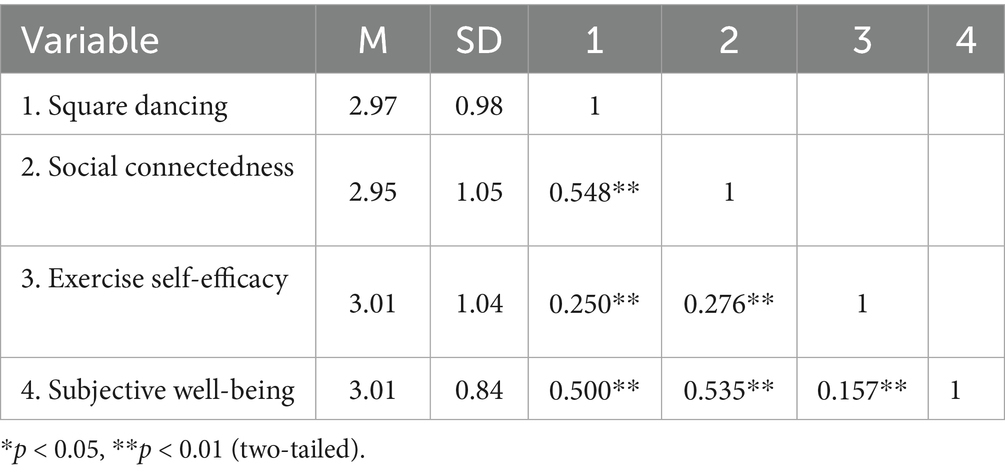 Conclusion: Middle-aged and older women who participate in square dancing not only directly enhance their subjective well-being but also indirectly improve it by strengthening their sense of social connectedness. Furthermore, individuals with higher levels of exercise self-efficacy experience more pronounced gains in social connectedness and subjective well-being through square dancing activities.