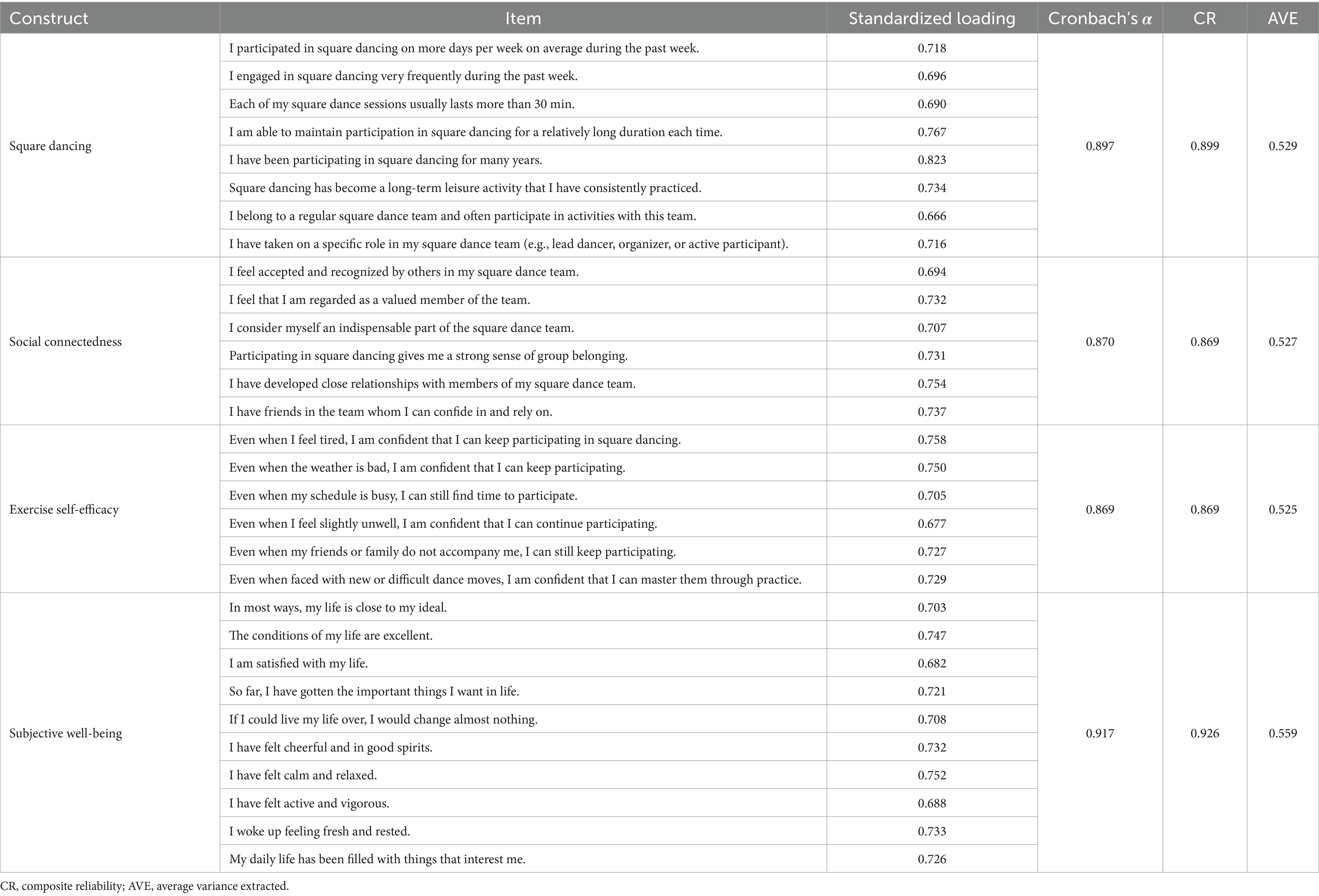 According to social cognitive theory, self-efficacy represents an individual’s belief in their ability to accomplish tasks and is a key determinant of motivation, persistence, and social behavior (19). Individuals with higher self-efficacy tend to set positive goals and maintain sustained engagement in square dancing, which is associated with a stronger sense of control and achievement. In turn, these beliefs are related to greater perceived social connectedness and higher levels of subjective well-being (10, 51).
