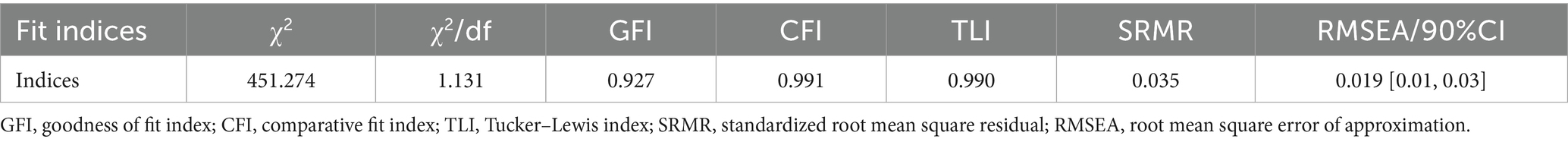 In addition, multiple fit indices were used to evaluate the overall goodness of fit of the measurement model, including χ2, χ2/df, GFI, CFI, TLI, SRMR, and RMSEA. As shown in Table 4, the model demonstrated excellent fit to the data (χ2 = 451.274, χ2/df = 1.131). All incremental fit indices exceeded the recommended threshold of 0.90 (GFI = 0.927, CFI = 0.991, TLI = 0.990), indicating strong model fit. Moreover, the SRMR value (0.035) and RMSEA value [0.019, 90% CI (0.01, 0.03)] were well below the conventional cut-off of 0.08, suggesting a close and acceptable fit between the hypothesized model and the observed data (43).