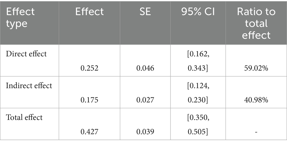 Table 6 shows the bootstrap results. The overall impact of square dancing on subjective well-being is significant [β = 0.427, 95% confidence interval (0.350, 0.505)]. The direct effect remains significant [β = 0.252, 95% confidence interval (0.162, 0.343)], accounting for 59.02% of the total effect, thus supporting H1. The indirect effect generated by social connectedness is also significant [β = 0.175, 95% confidence interval (0.124, 0.230)], explaining 40.98% of the total effect and supporting H2. These findings provide empirical evidence for some mediation models, indicating that square dancing directly and indirectly improves subjective well-being by enhancing social connectedness.