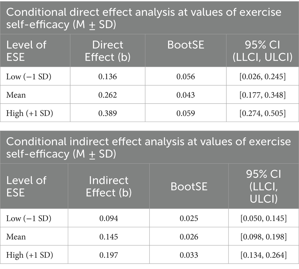 Exercise Self-Efficacy (ESE) refers to an individual’s confidence in their ability to persist in physical exercise and achieve predetermined goals despite obstacles or difficulties (18). Social cognitive theory posits that self-efficacy is a key psychological resource shaping individual behavior. It not only determines whether people will actively engage in specific behaviors but also influences the persistence and ultimate effectiveness of those behaviors (19). In the field of physical education and health, extensive research confirms a significant positive correlation between exercise self-efficacy and levels of physical activity participation, psychological well-being, and life satisfaction (20, 21).