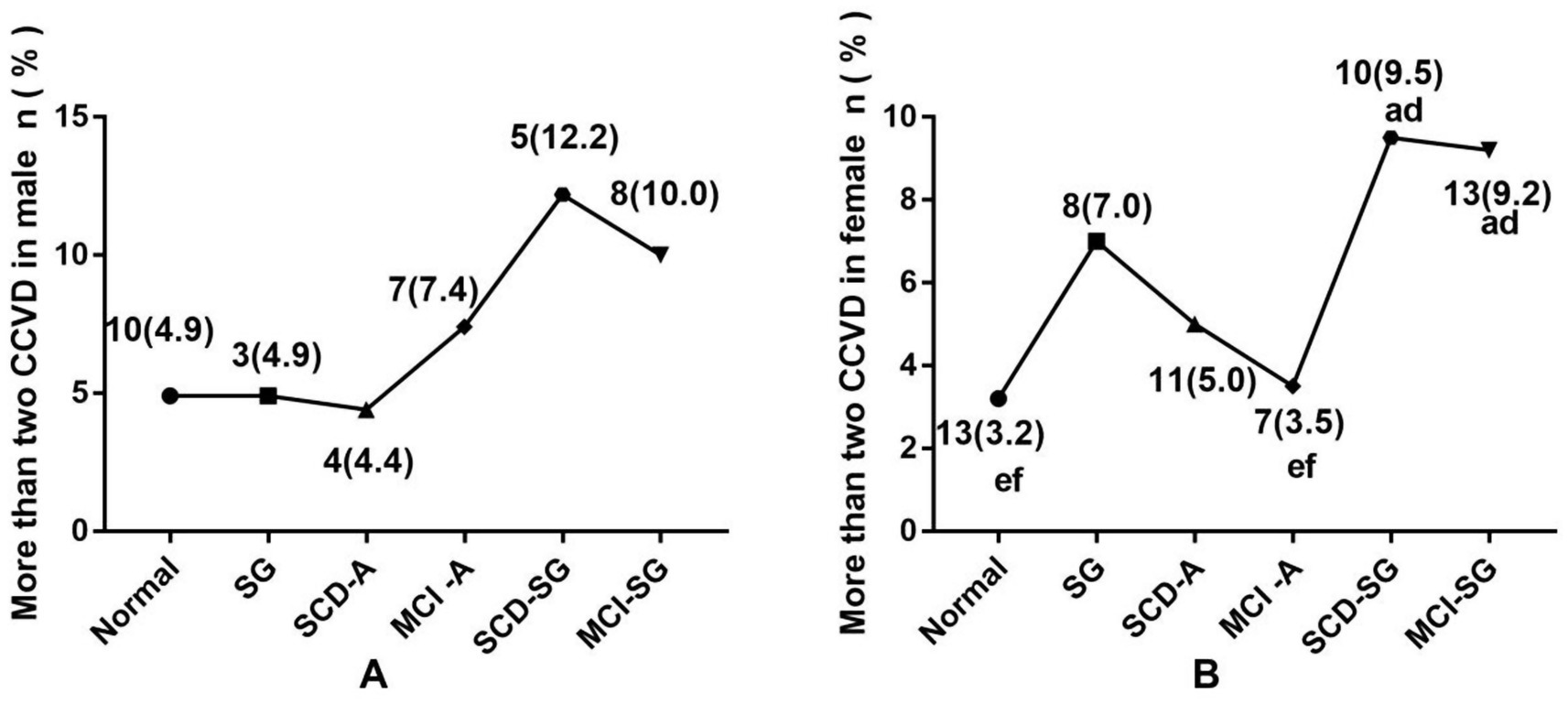 Figure 2. (A) The difference prevalence of more than two CCVD among six groups in male. (B) The difference prevalence of more than two CCVD among six groups in female. CCVD, Cardiovascular and cerebrovascular diseases. aSignificantly different from the normal group. bSignificantly different from the SG group. cSignificantly different from the SCD-A group. dSignificantly different from the MCI-A group. eSignificantly different from the SCD-SG group. fSignificantly different from the MCI-SG group.