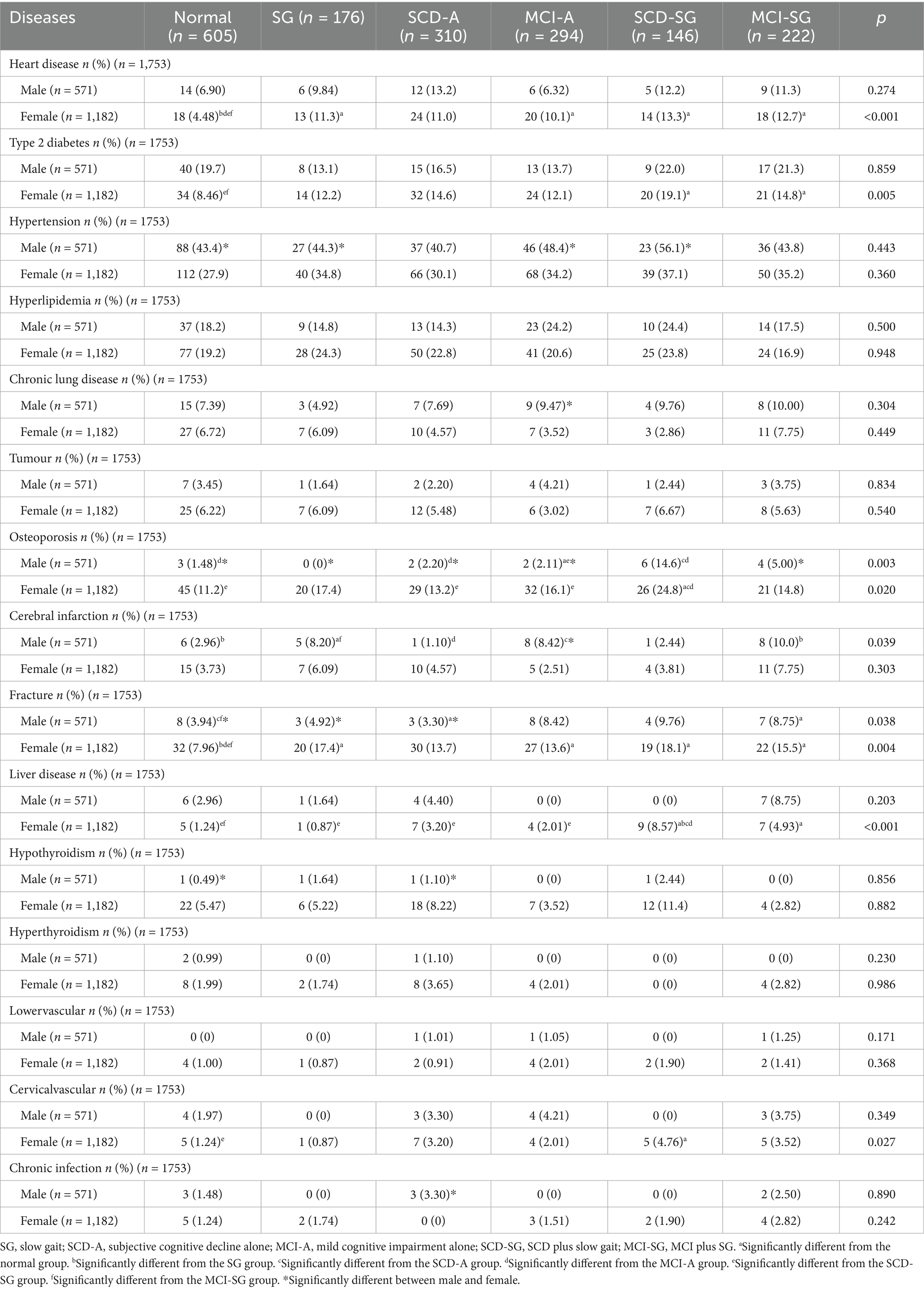Our study focused on multimorbidity in cognitive frailty, which is the integration of cognitive function severity and gait speed, enabling comprehensive characterization of cognitive frailty. We observed osteoporosis was more prevalent in both genders with concurrent cognitive decline and slow gait (SG), with females at higher risk. Certain age-related metabolic diseases were also more common in women, potentially driven by genetic and hormonal factors. These findings align with prior research reporting elevated burdens of age-related conditions, such as type 2 diabetes, cerebral infarction, heart disease, fractures in individuals with SCD and SG (24, 25). Notably, we detail individual comorbidities instead of relying on aggregate indices like the Charlson Comorbidity Index. This granular approach revealed hypertension, hyperlipidemia, chronic lung disease, tumors, thyroid disorders, and chronic infections were not highly prevalent in our cognitive frailty cohorts—differing from studies that found no significant differences in common metabolic or endocrine conditions across SCD, MCI, and AD groups (26–28). These observations support cognitive frailty’s potential reversibility in preclinical stages: modifiable comorbidities, such as osteoporosis, age-related metabolic diseases identified here are actionable intervention targets. Targeting osteoporosis via lifestyle or pharmacological strategies, for instance, may mitigate cognitive frailty progression, supporting early intervention feasibility. Alignment with prior evidence (24, 25) reinforces addressing multimorbidity in early cognitive frailty, while our distinct profile underscores the need for larger longitudinal studies to refine intervention frameworks.