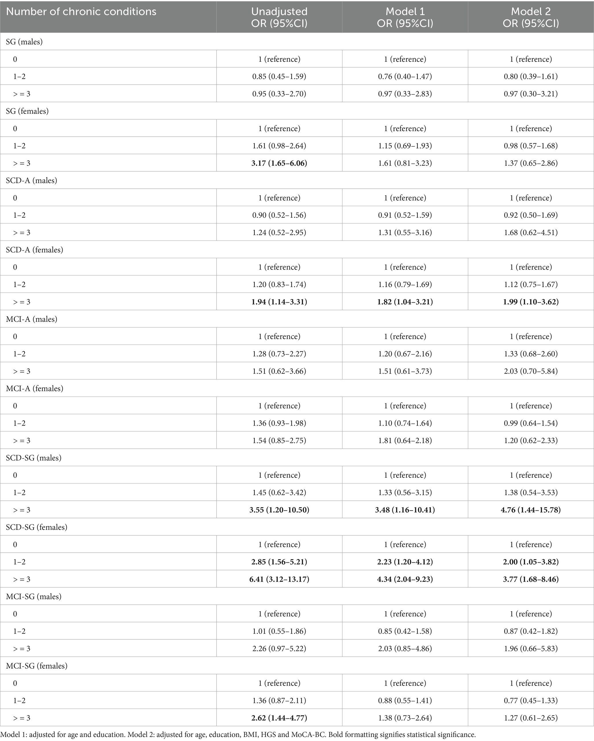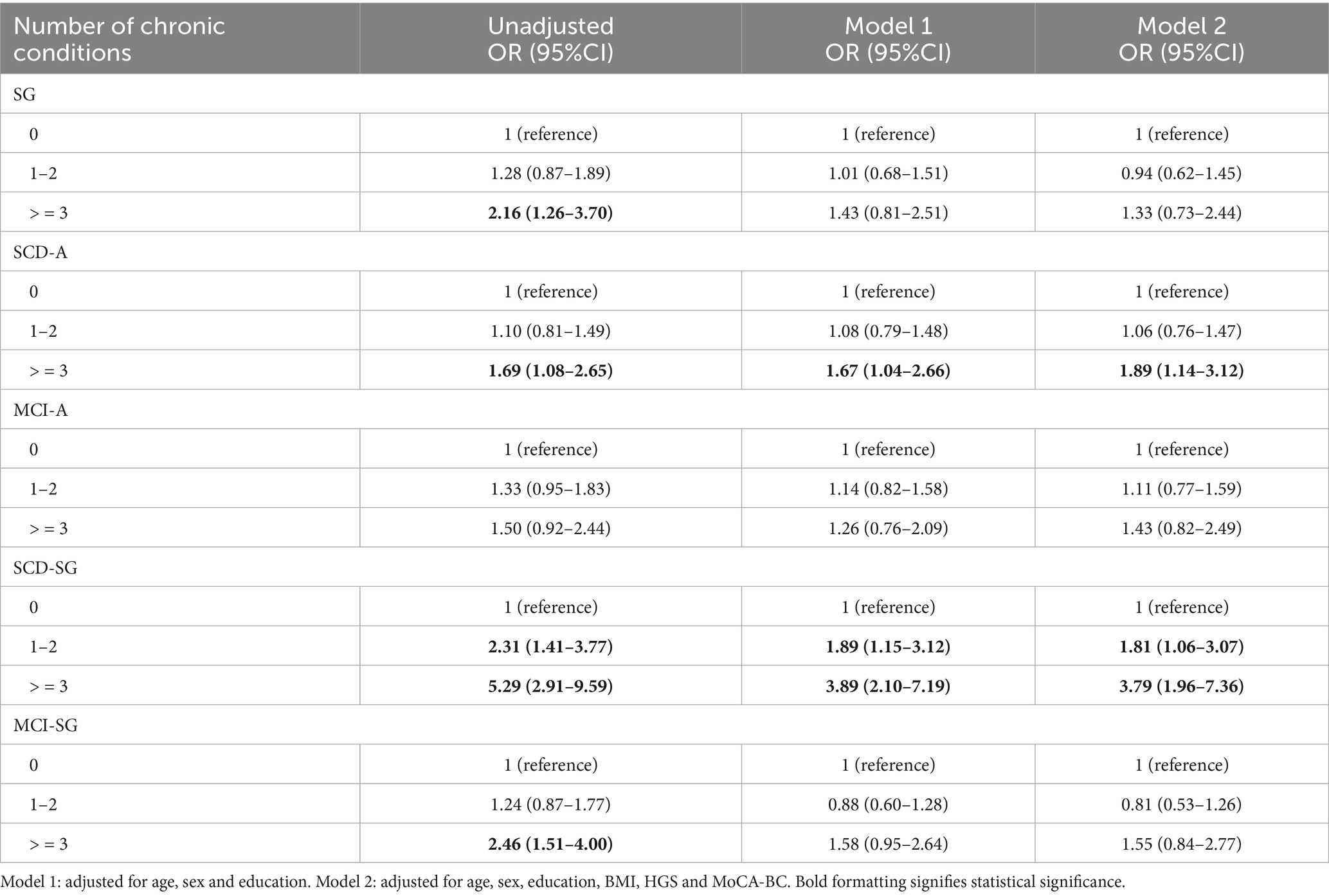 In all participants, when adjusted for age, gender, education, BMI, HGS, and MoCA-BC, compared to the normal group, it was found that the SCD-A group had a greater risk of developing at least two chronic conditions (OR = 1.89, 95% CI: 1.14–3.12), whereas the SCD-SG group had a 2.79 times higher risk of developing more than two chronic conditions (Table 3).