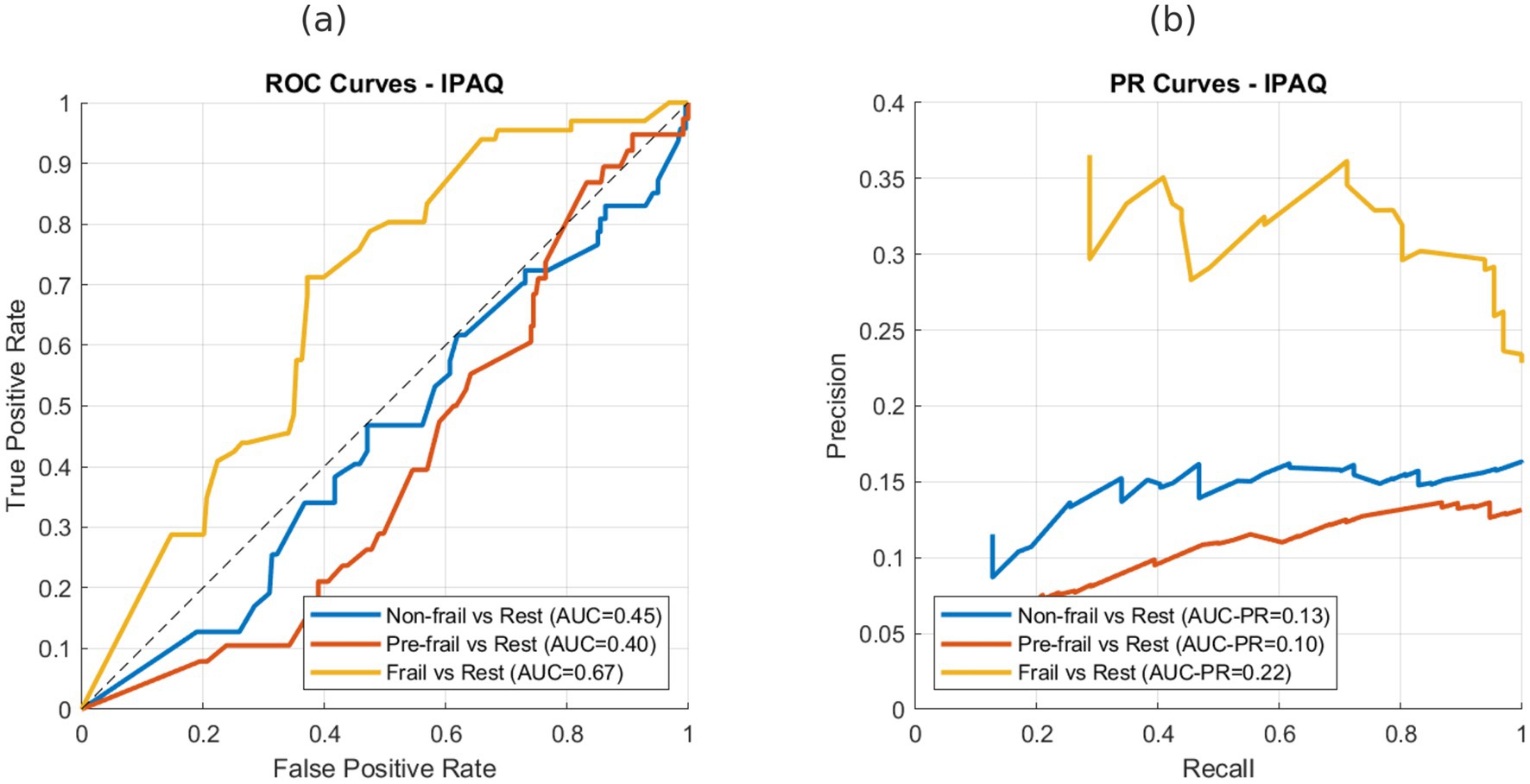 Figure 1. ROC and precision–recall curves for IPAQ-SF in discriminating frailty groups. (a) ROC curves for non-frail, pre-frail, and frail groups (AUC = 0.45, 0.40, and 0.67, respectively). (b) Precision–recall curves for non-frail, pre-frail, and frail groups (AUC-PR = 0.13, 0.10, and 0.22, respectively).