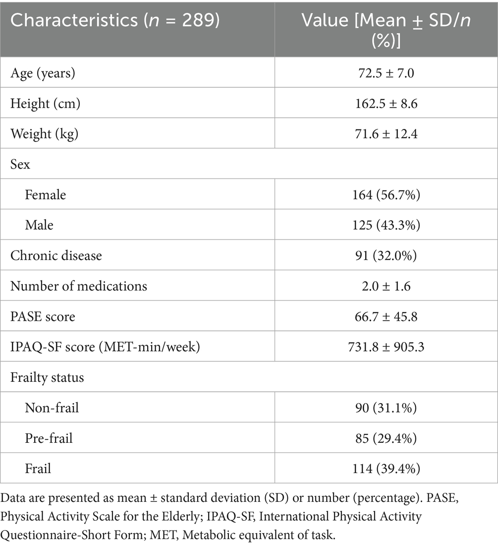 A total of 289 older adults participated in this study. The mean age of the participants was 72.5 ± 7.0 years, with 56.7% women and 43.3% men. The mean height and body weight were 162.5 ± 8.6 cm and 71.6 ± 12.4 kg, respectively. At least one chronic condition was present in 32% of the participants, and the mean number of medications used was 2.0 ± 1.6. Regarding physical activity, the mean PASE score was 66.7 ± 45.8, while the mean IPAQ total score was 731.8 ± 905.3 MET-min/week. Frailty status was distributed as follows: 31.1% non-frail (n = 90), 29.4% pre-frail (n = 85), and 39.4% frail (n = 114) (Table 1).