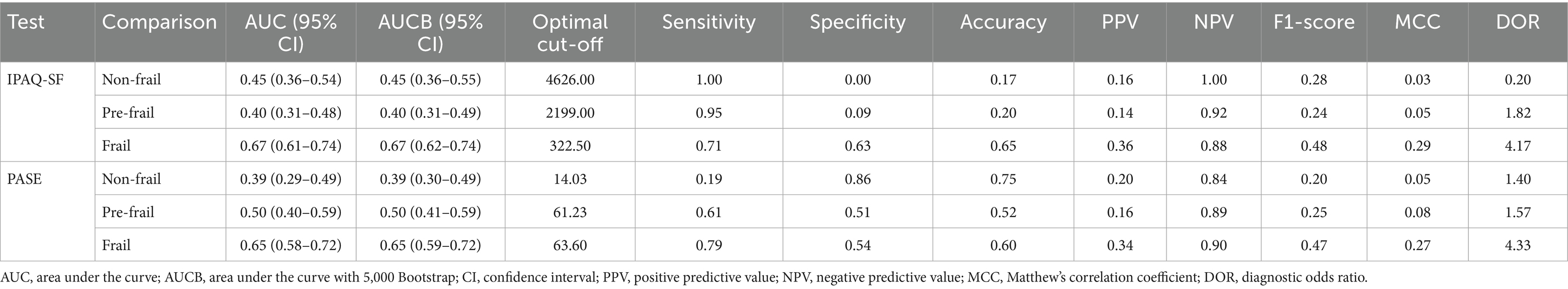 Measurement reliability also requires consideration. Previous research on patients with Parkinson’s disease reported that IPAQ-SF exhibited relatively low test–retest reliability, whereas PASE showed moderate reliability (29). Similar concerns were echoed by Theou et al. (18), who found that objective physical activity measures, such as accelerometry, explained greater variance in frailty indices than questionnaires. Moreover, Ma et al. (30) demonstrated that vigorous and moderate physical activity, but not light-intensity activity, were associated with reduced frailty risk in a large cohort, underscoring the importance of capturing meaningful activity levels. Additionally, Kim et al. (31) introduced a frailty phenotype questionnaire based on Fried’s criteria, which showed substantially higher diagnostic performance than general physical activity questionnaires, highlighting the potential advantage of purpose-built frailty tools.
