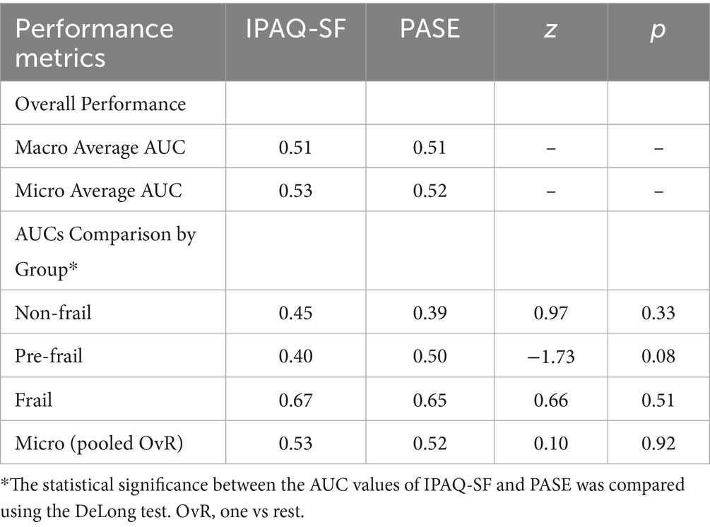Macro−/micro-ROC analyses demonstrated macro-AUC and micro-AUC values of 0.51 and 0.53 for IPAQ-SF, and 0.51 and 0.52 for PASE, respectively. The DeLong test indicated no statistically significant differences between the IPAQ-SF and PASE in the non-frail (p = 0.33), pre-frail (p = 0.08), or frail groups (p = 0.51). Similarly, the pooled micro-analysis revealed no significant difference between the two instruments (p = 0.92) (Table 3).