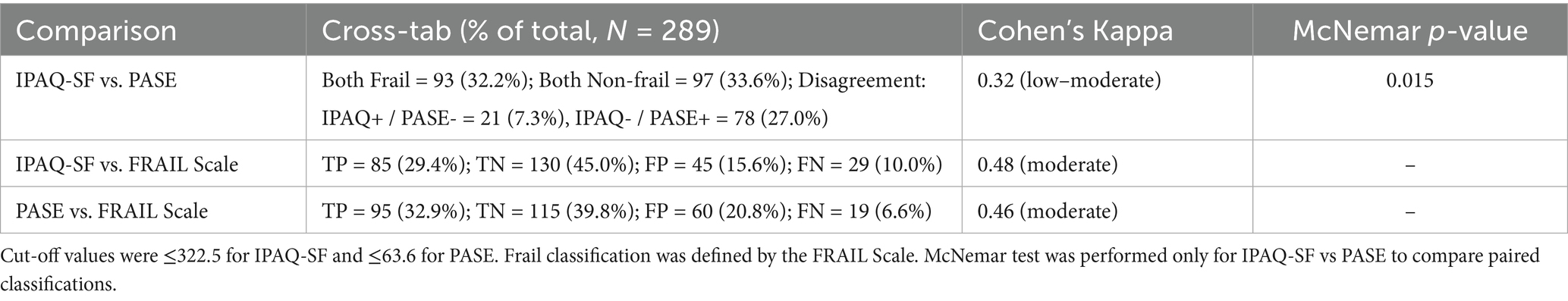 Both instruments demonstrated moderate agreement with the FRAIL Scale in identifying frail individuals (IPAQ-SF: κ = 0.48; PASE: κ = 0.46). In contrast, the direct comparison between the IPAQ-SF and PASE yielded only low-to-moderate agreement (κ = 0.32), and the classification differences were statistically significant (McNemar p = 0.015) (Table 4).