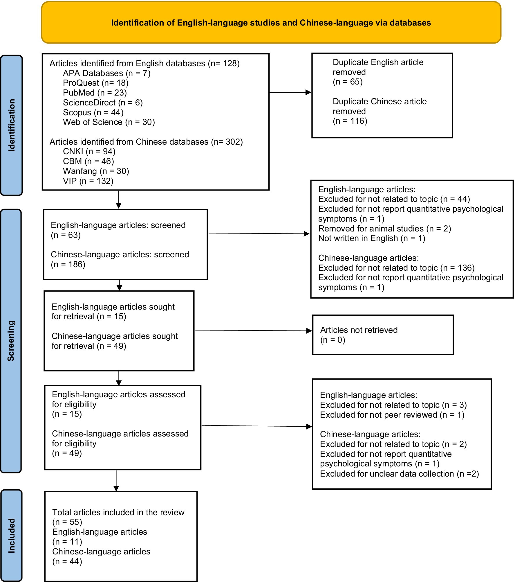 In the Chinese literature search, we identified 302 articles from the database searches. We initially removed 116 duplicates and then excluded 137 articles that were not related to the topic or did not report quantitative psychological symptoms. Thereafter, we conducted a full-text eligibility assessment on the remaining 49 articles and decided to exclude five articles that were not related to the topic, lacked transparent reporting of the data collection process, or did not report quantitative results. Finally, we included 44 articles in the present review.