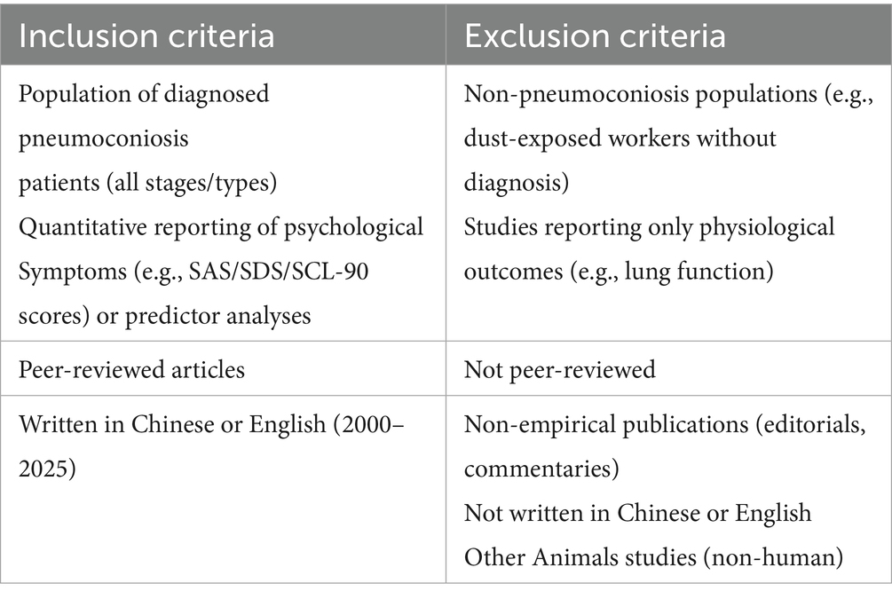 Research shows that individuals with chronic diseases in general experience poorer mental health more frequently than those without chronic conditions (5). Social, material, and relational problems increase mental health risks. Specific stressors, such as financial strain, housing instability, intimate relationship difficulties, and sexual concerns, occur more often among chronic disease populations (6). Considering that most pneumoconiosis forms are chronic conditions, the mental well-being of pneumoconiosis patients demands attention from public health and occupational health systems. Indeed, existing studies have revealed higher mental health risks among pneumoconiosis patients (7, 8). However, to date, no review has systematically synthesized findings across both publications in the Chinese and English languages. This knowledge gap prevents a complete understanding of the symptom patterns and management needs of pneumoconiosis patients. In response to this situation, the present scoping review aims to map the existing body of evidence across diverse study designs and across the two languages.