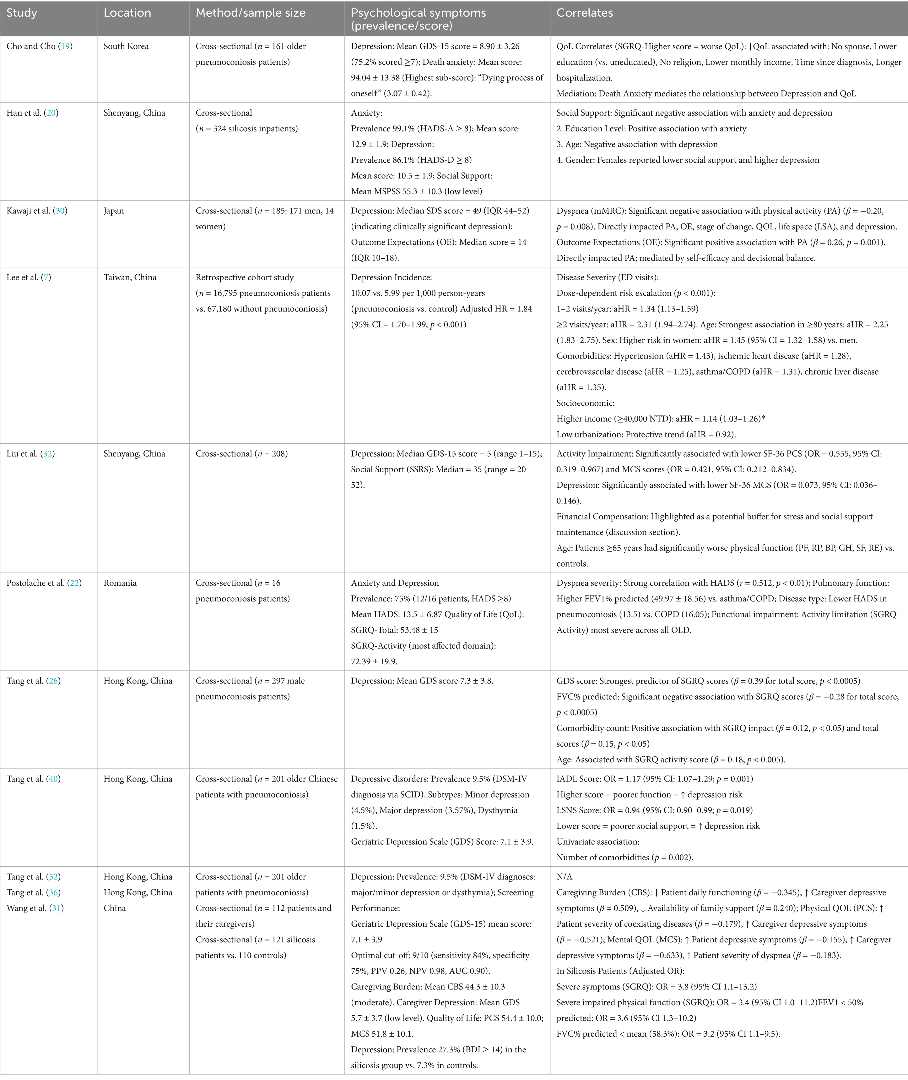 English-language and Chinese-language studies showed clear differences in research design, suggesting distinct research priorities. The 11 English-language studies (Table 2) included 10 cross-sectional studies and one retrospective cohort study (7). Only the cohort design enabled quantifying depression incidence rates over time (per 1,000 person-years). It allowed calculation of adjusted hazard ratios (aHRs) comparing pneumoconiosis patients with matched controls. This approach directly addressed temporal relationships and quantified risk. The incidence rate reported by Lee et al. (7) indicates an increased risk. However, this study’s cohort design and operational definitions differed significantly from the cross-sectional prevalence studies, contributing to overall heterogeneity. Conversely, among the 44 Chinese language studies (Table 3), 39 employed cross-sectional designs, two employed case–control methodologies (12, 13), 1 employed a retrospective analysis (14), 1 employed an experimental intervention (15), and 1 used a tracking survey (16). The case–control studies specifically enabled direct comparisons. These comparisons examined psychological symptom prevalence and scores between pneumoconiosis patients and non-exposed controls (e.g., depression rates (12)). The experimental study (15) uniquely assessed the effects of a specific intervention (exercise) on symptoms like fatigue and anxiety.