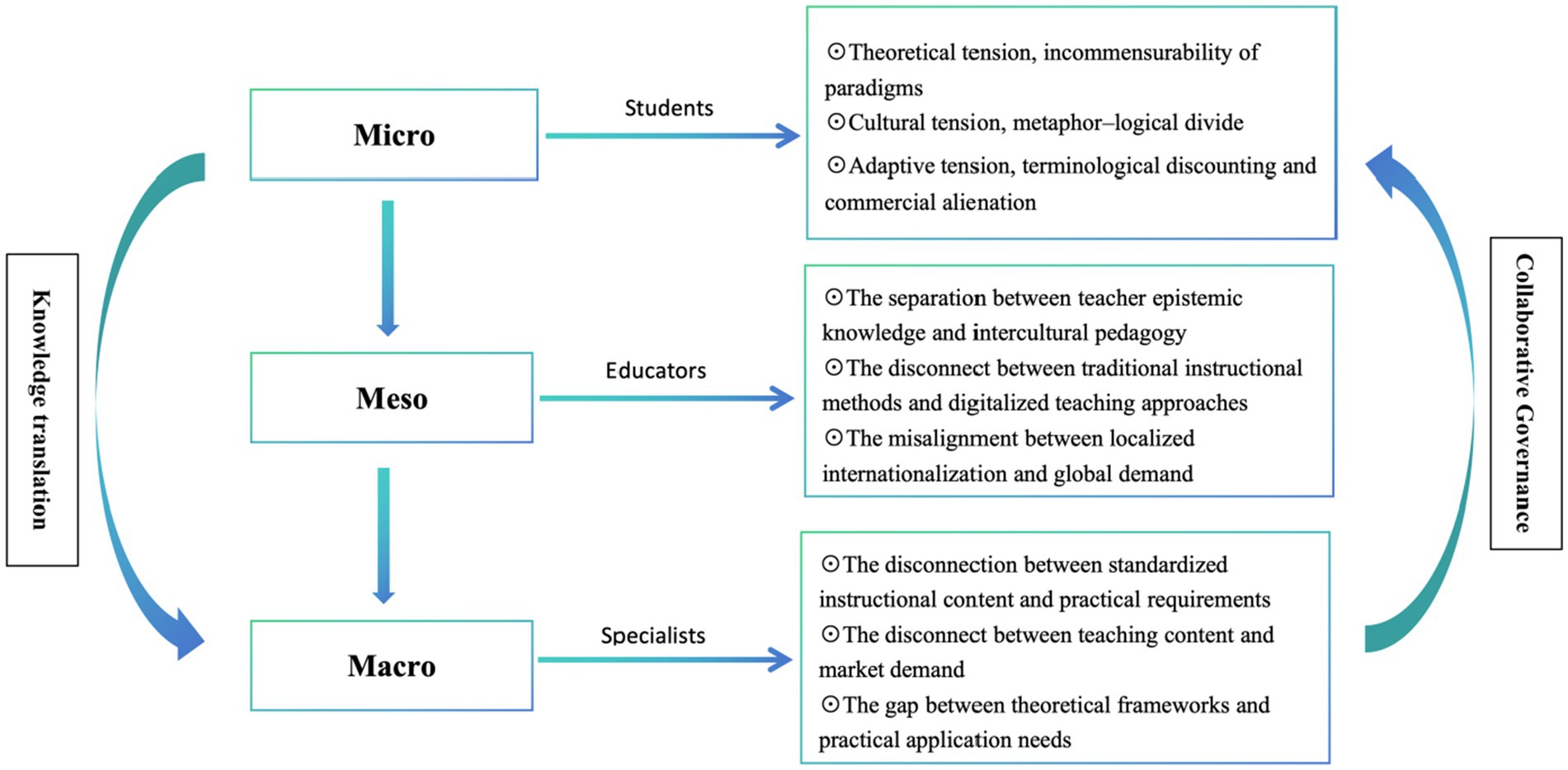 The analysis indicates that the primary source of observed discrepancies stems from the conflict between institutional paradigms and practical implementation within the internationalization of TCM higher education. Specifically, the rapid internationalization of TCM higher education, driven by policy initiatives such as the Belt and Road Initiative, has facilitated increased international exchanges and demand for global dissemination. Nonetheless, the development of human capital and educational infrastructure remains insufficient, with a limited pool of professionals skilled in international TCM communication. Prior research has predominantly concentrated on terminological accuracy and standardization, with limited focus on cultivating international communication competencies, curriculum development, instructional content, and educational resources such as textbooks (52). This study employs a multi-tiered analytical framework encompassing Micro-Meso-Macro.
