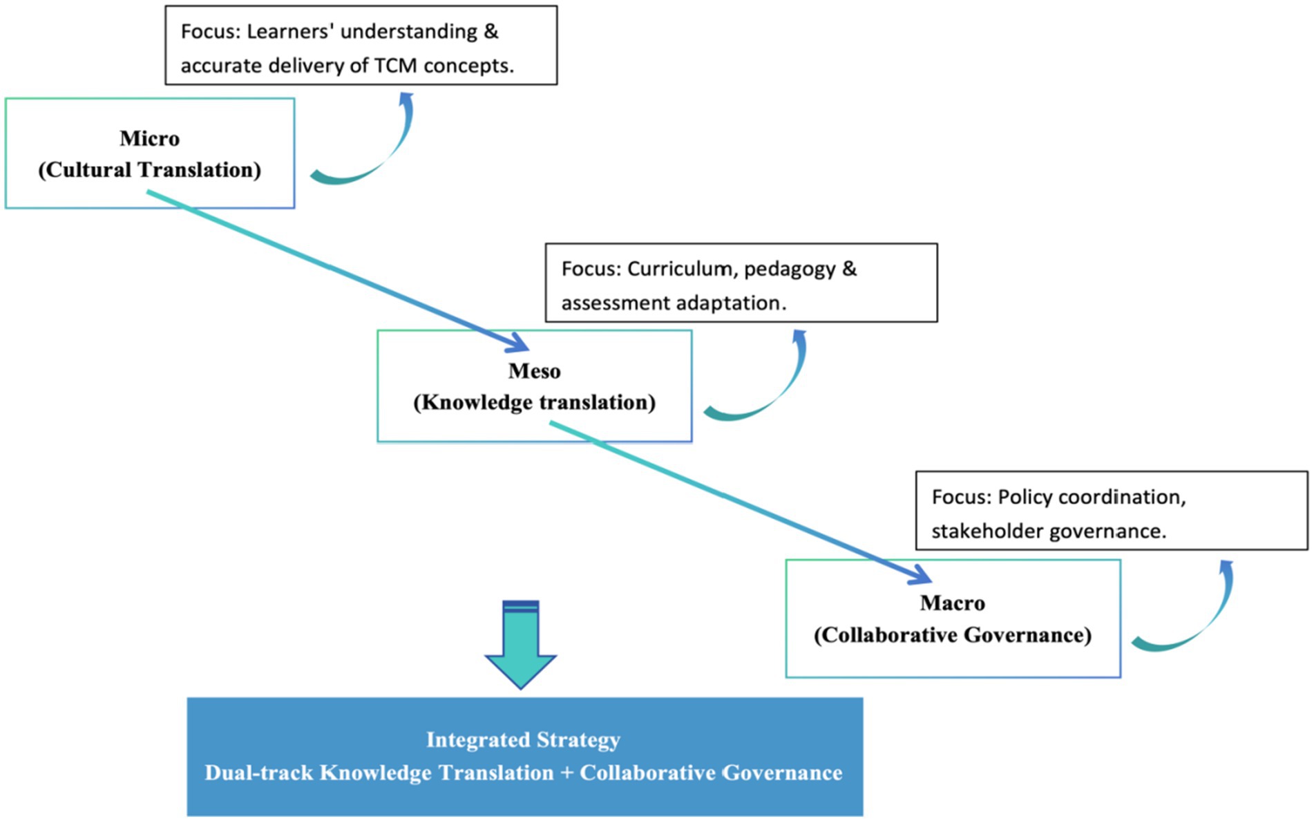 Building upon existing literature, this study synthesizes cultural translation, knowledge transformation, and collaborative governance within a multi-level analytical framework (41), establishing a three-dimensional model—micro, meso, and macro—to examine the cultivation of talent for international TCM dissemination. Specifically, at the micro level, cultural translation pertains to individual learners’ capacity to comprehend and accurately communicate TCM concepts. At the meso level, knowledge transformation involves adapting curricula, pedagogical approaches, and assessment systems through institutional strategies to accommodate diverse cultural and educational contexts. At the macro level, collaborative governance emphasizes policy and structural mechanisms designed to coordinate stakeholder relationships and facilitate systemic reforms. This integrated framework enables comprehensive analysis of barriers and facilitators and provides a foundation for developing a “dual-track knowledge transformation coupled with collaborative governance” strategy (Figure 2). Such an approach aims to preserve the integrity of TCM knowledge and theoretical frameworks while enhancing pedagogical flexibility and ensuring regulatory compliance, thereby addressing the diverse needs of the global healthcare landscape.