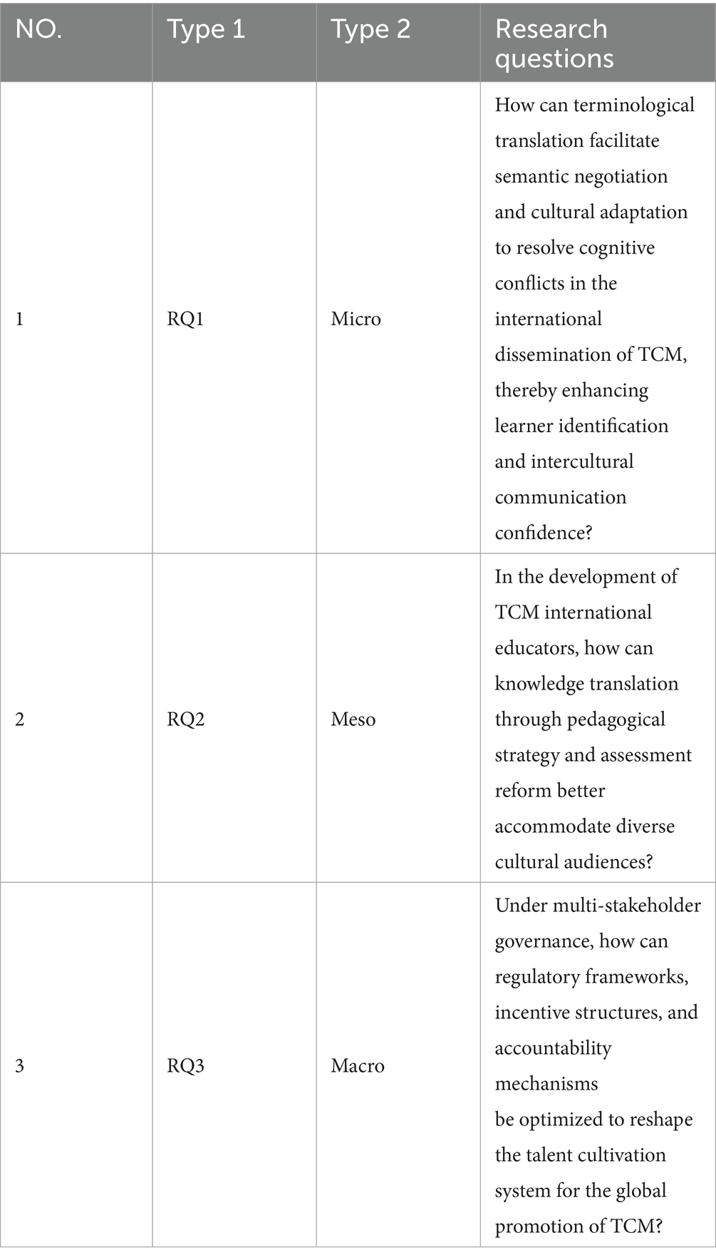 This research gap holds considerable significance within the domain of traditional medicine globalization. On one hand, the deficiency in effective intercultural competency training leads to the reduction of core Traditional Chinese Medicine (TCM) concepts—such as “Qi”, "Yin-Yang” and the “Five Elements”-to metaphysical symbols or overly simplified biomedical analogies (13), thereby compromising their epistemological validity and clinical efficacy. On the other hand, discrepancies between domestic curricula and international accreditation standards often necessitate redundant overseas training for graduates; additionally, inadequate intercultural competence may result in patient mistrust and resistance to policy implementation (14). If these issues remain unaddressed, the global legitimacy of TCM could be undermined, and its capacity for intercultural dialogue and knowledge exchange may be impeded. Consequently, this study primarily investigates the following research questions (RQ) (Table 1).