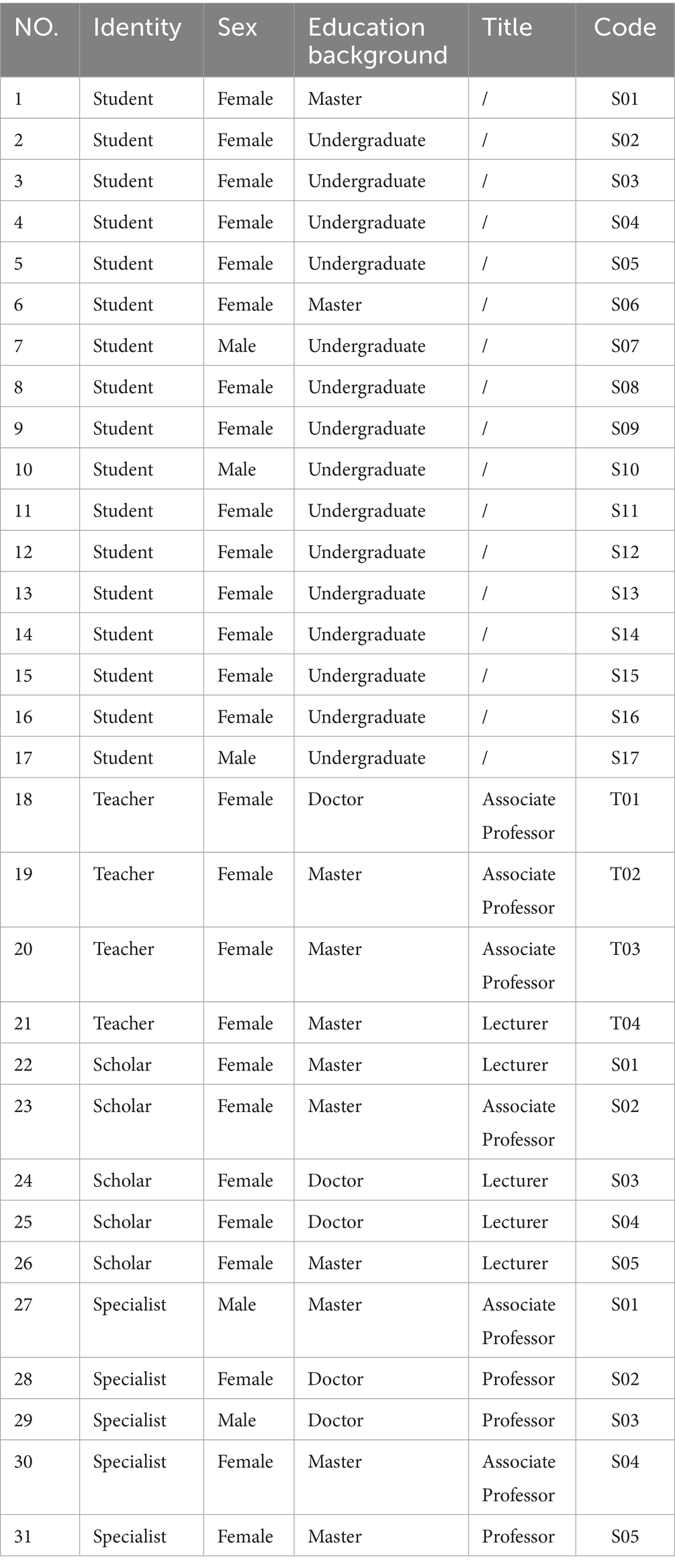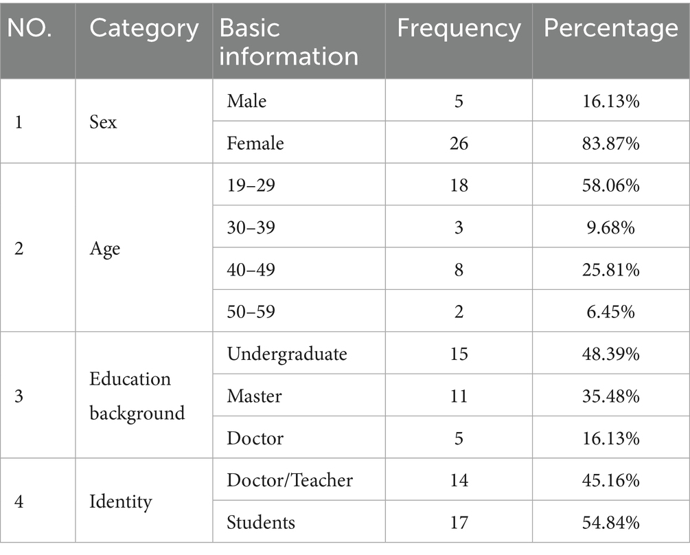 Participants were recruited via purposive maximum variation sampling (43), with data collection occurring between May 15 and June 10, 2025. A total of 31 individuals from diverse academic and professional backgrounds—including students, scholars, experts, and educators—were invited to participate. The students’ academic qualifications include undergraduate and graduate students; the scholars’ majors include linguistics, TCM, Chinese literature, etc.; and the experts include experts in the fields of TCM, traditional Chinese pharmacology, TCM culture, and international dissemination of TCM culture. The sample was intentionally heterogeneous to enhance the comprehensiveness and representativeness of the findings. Participant demographic details are summarized in Table 1. All participants provided informed consent, having been thoroughly briefed on the study’s aims and potential implications (47). Basic demographic data such as age, gender, academic credentials, and years of professional experience were recorded and anonymized during subsequent analysis.