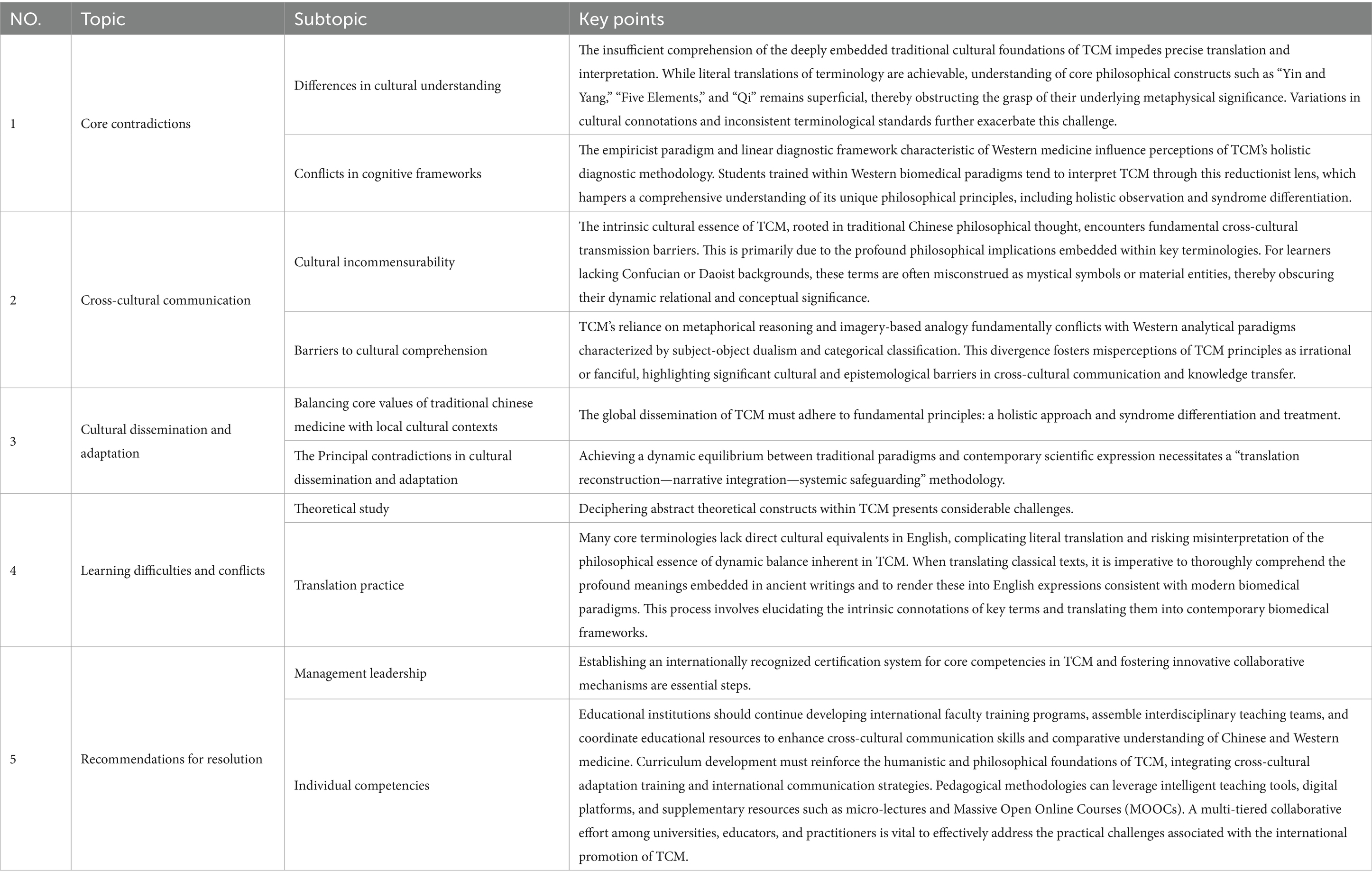 Through a systematic and detailed qualitative analysis, we identified and synthesized five core thematic categories, each comprising several subthemes. These thematic constructs elucidate the key challenges and ethical considerations encountered by practitioners engaged in the international propagation of TCM. The results offer an in-depth perspective on the multifaceted obstacles faced in the global dissemination of TCM (Table 4).