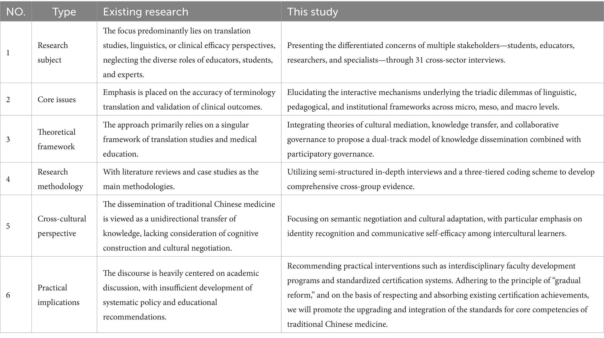 Nevertheless, this research uncovers notable divergences in the focal points among different participant cohorts concerning the challenges associated with TCM’s international propagation (Table 5). Compared to existing international studies, this research underscores its distinctiveness and innovative approach. Specifically, students and educators predominantly address linguistic and conceptual obstacles encountered at the pedagogical interface. Conversely, scholars and domain experts prioritize issues related to the inadequacy of interdisciplinary paradigm integration and the deficiencies within institutionalized training pathways.