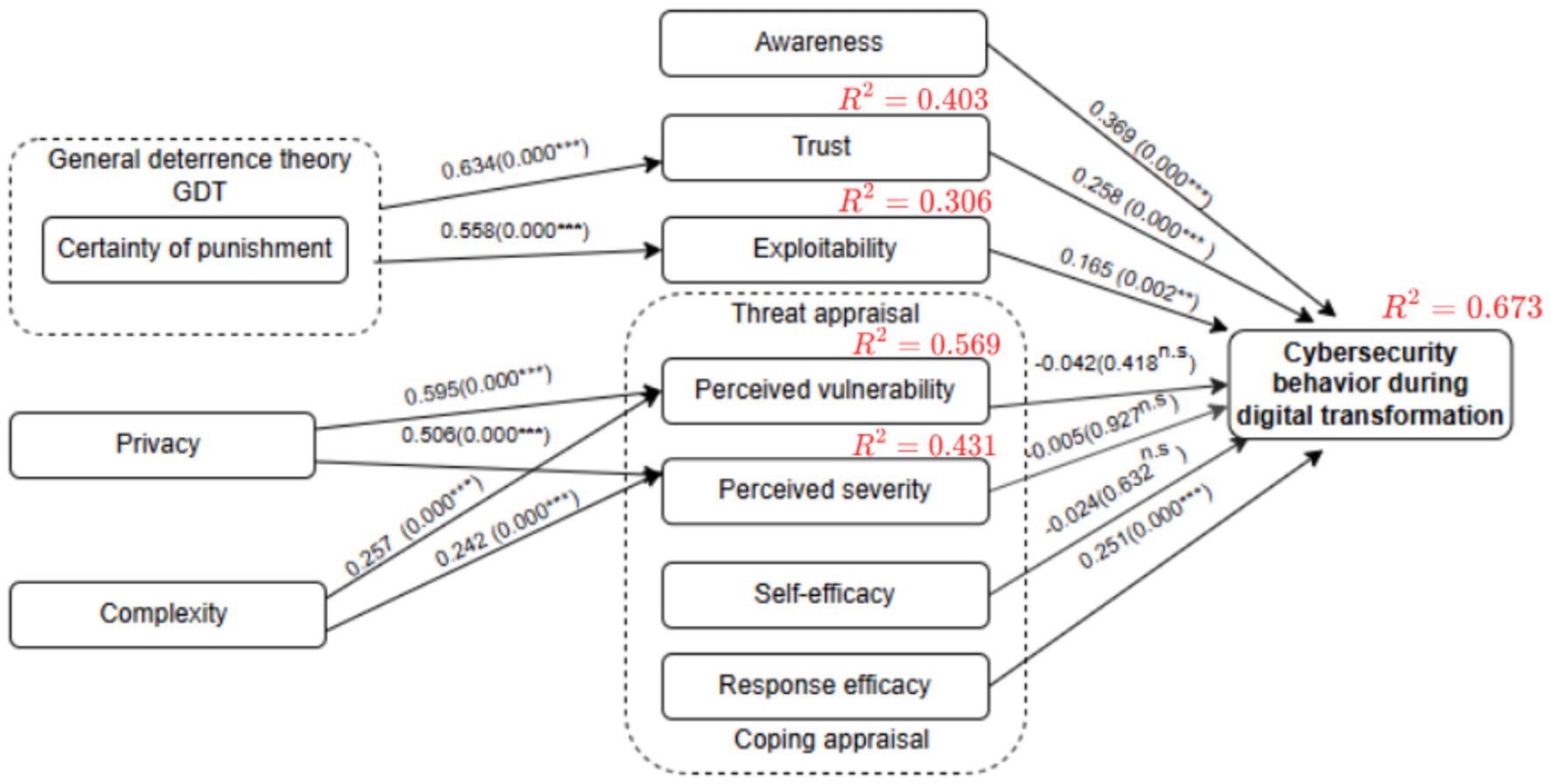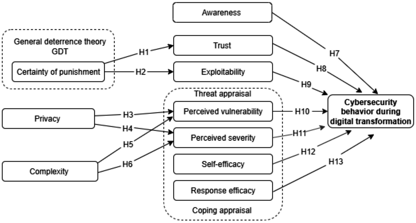 H10: Perceived vulnerability positively influences cybersecurity behavior during digital transformation.