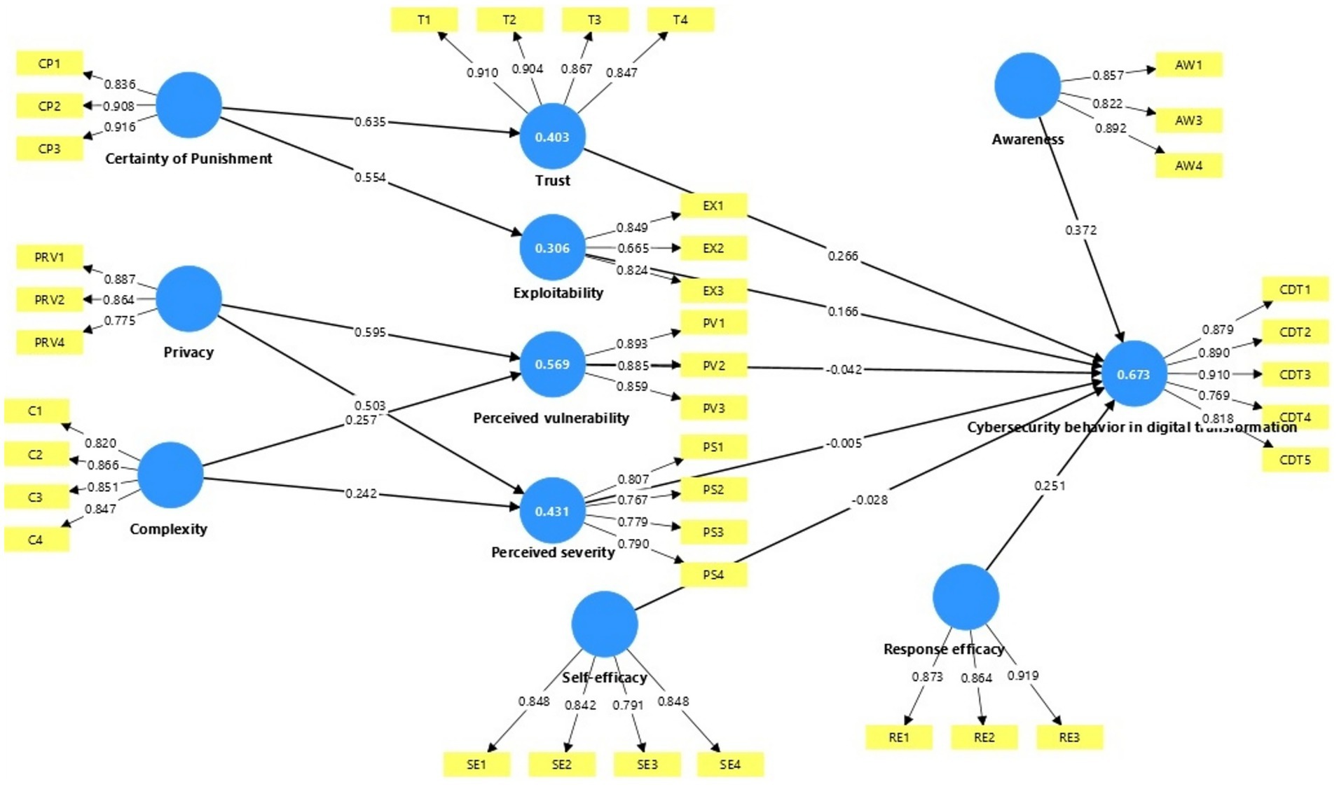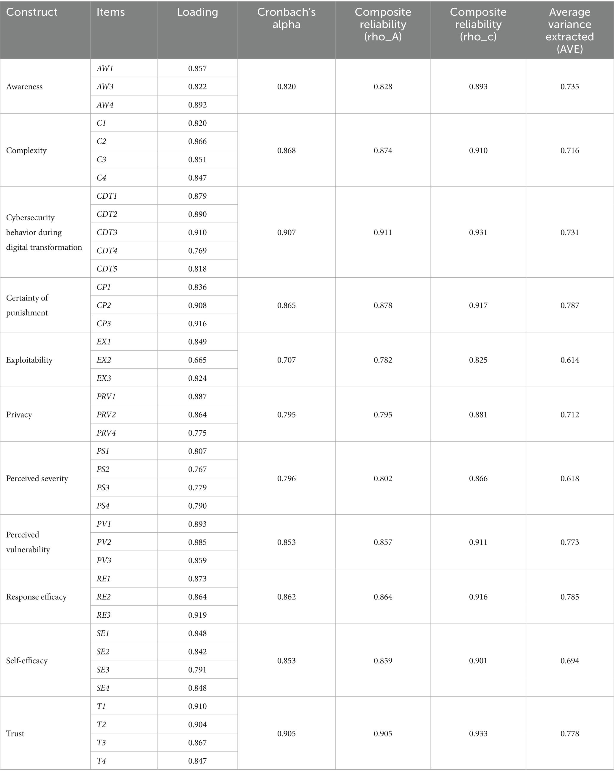 The privacy construct (PRV) was reflected by four items adopted from (56). Four items adopted from (56, 62) were used to measure perceived severity during digital transformation (PS). Trust in digital systems (T) was measured by four items adapted from (56). The three items to measure perceived vulnerability during digital transformation (PV) were adapted from (62). The current study also adapted four reflective items from (15, 47) to measure employee self-efficacy (SE). Response efficacy (RE) was measured by three items taken from (62). Certainty of punishment (CP) was measured by three items taken from (15). Measured complexity (C) by four items adapted from (58). Awareness (AW) was measured by four items adapted from (15, 19). Exploitability (EX) was measured by four items developed by the researcher. Finally, cybersecurity behavior during digital transformation (CDT) was measured by five reflective items adapted and modified from (19, 62). All measurement items that used 7-point Likert scales were assigned a serial number ranging from 1–7. The scales ranged from “1” for “strongly disagree” to “7” for “strongly agree” as suggested by (76).