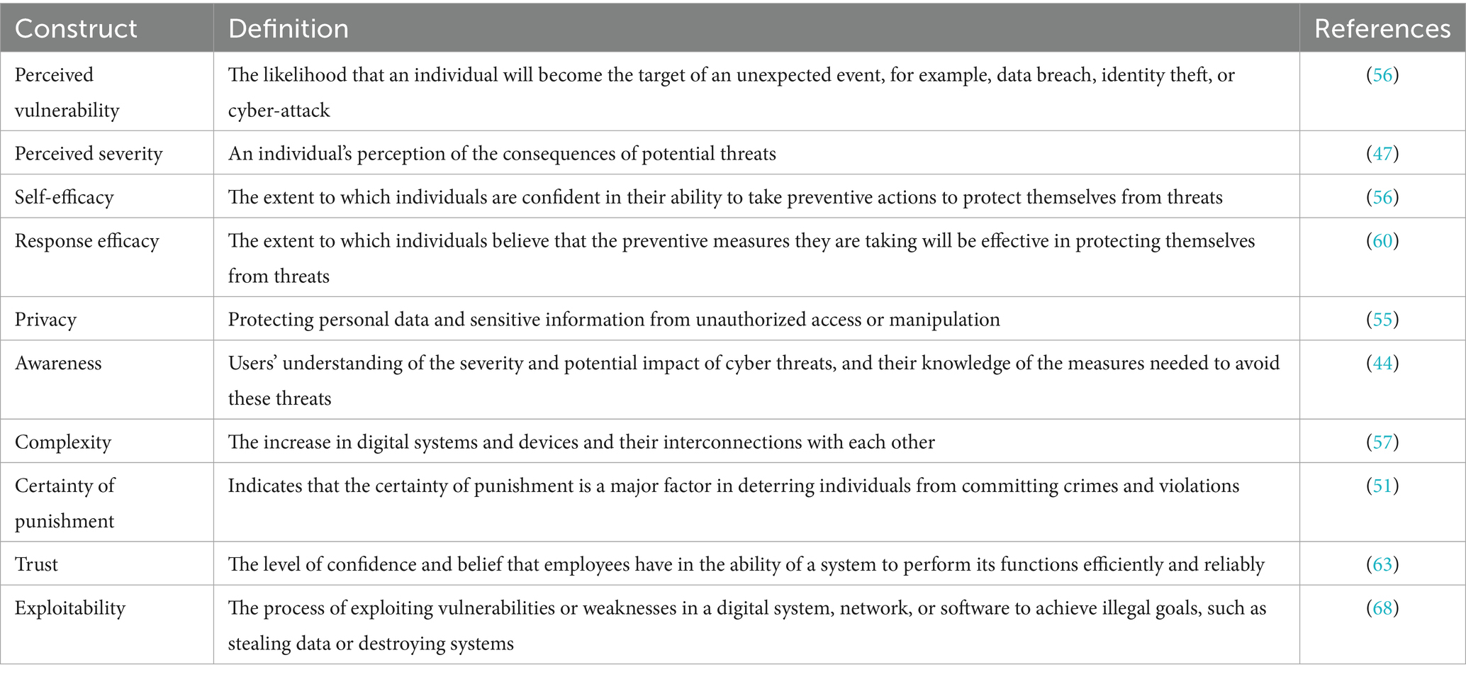114. D’arcy, J, and Herath, T. A review and analysis of deterrence theory in the IS security literature: making sense of the disparate findings. Eur J Inf Syst. (2011) 20:643–58. doi: 10.1057/ejis.2011.23