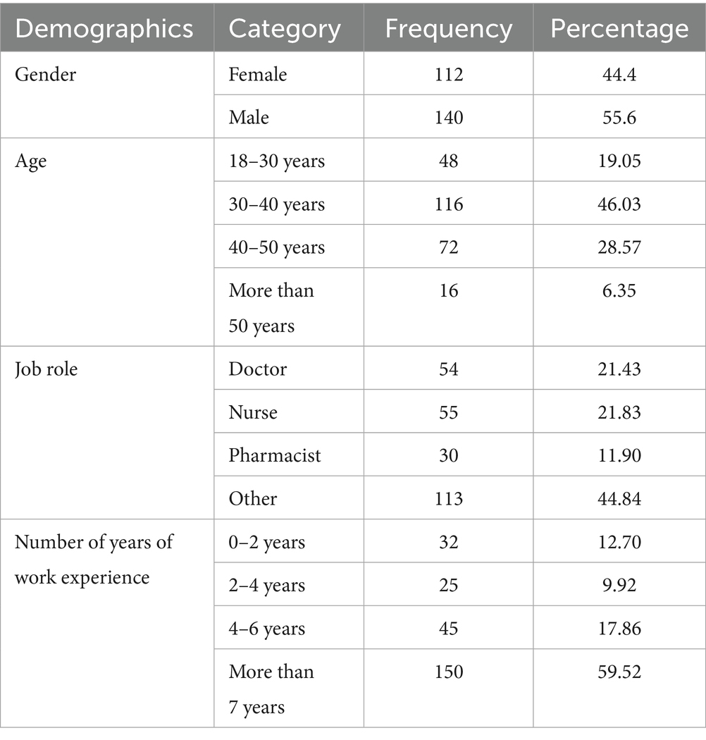 The descriptive statistics of the study’s sample provided a clear view of the distribution of participants based on demographic variables. The demographic characteristics of participants, all of whom worked in various health sector jobs, were collected through the survey, including gender, age group, job title, and years of experience, as shown in Table 2. According to the results, 55.6% (n = 112) of the participants were female, while 44.4% (n = 140) were male. The result showed a higher frequency of male participants compared to female participants in this study. Moreover, analysis showed that the largest group of participants was within the age group of 30–40 years (46.03%; n = 116), followed by the age group of 40–50 years (28.57%; n = 72), while 19.05% (n = 48) were in the age group of 18–30 years, indicating a good representation of youth in the sample. The least represented group comprised those aged over 50 years at 6.35% (n = 16).