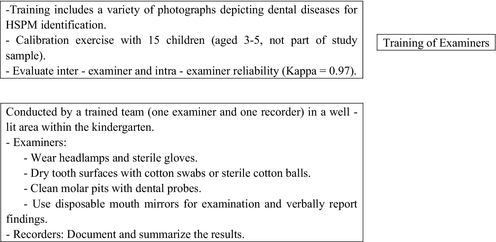 Experienced dentists provided theoretical training to two examiners responsible for conducting all clinical evaluations. This training included a variety of photographs depicting dental diseases to aid in the identification of HSPM. Additionally, a calibration exercise was carried out with a group of 15 children between the ages of 3 and 5 years, who were not part of the study sample. After this exercise, both inter-examiner and intra-examiner reliability were evaluated and determined to be high (Kappa = 0.97). All clinical assessments were conducted by the same trained team (comprising one examiner and one recorder) in a designated, well-lit area within the kindergarten. The specific process details are shown in Figure 1. The HSPM assessment is based on the standards of the European Academy of Paediatric Dentistry (EAPD) and is conducted by Figure 2.