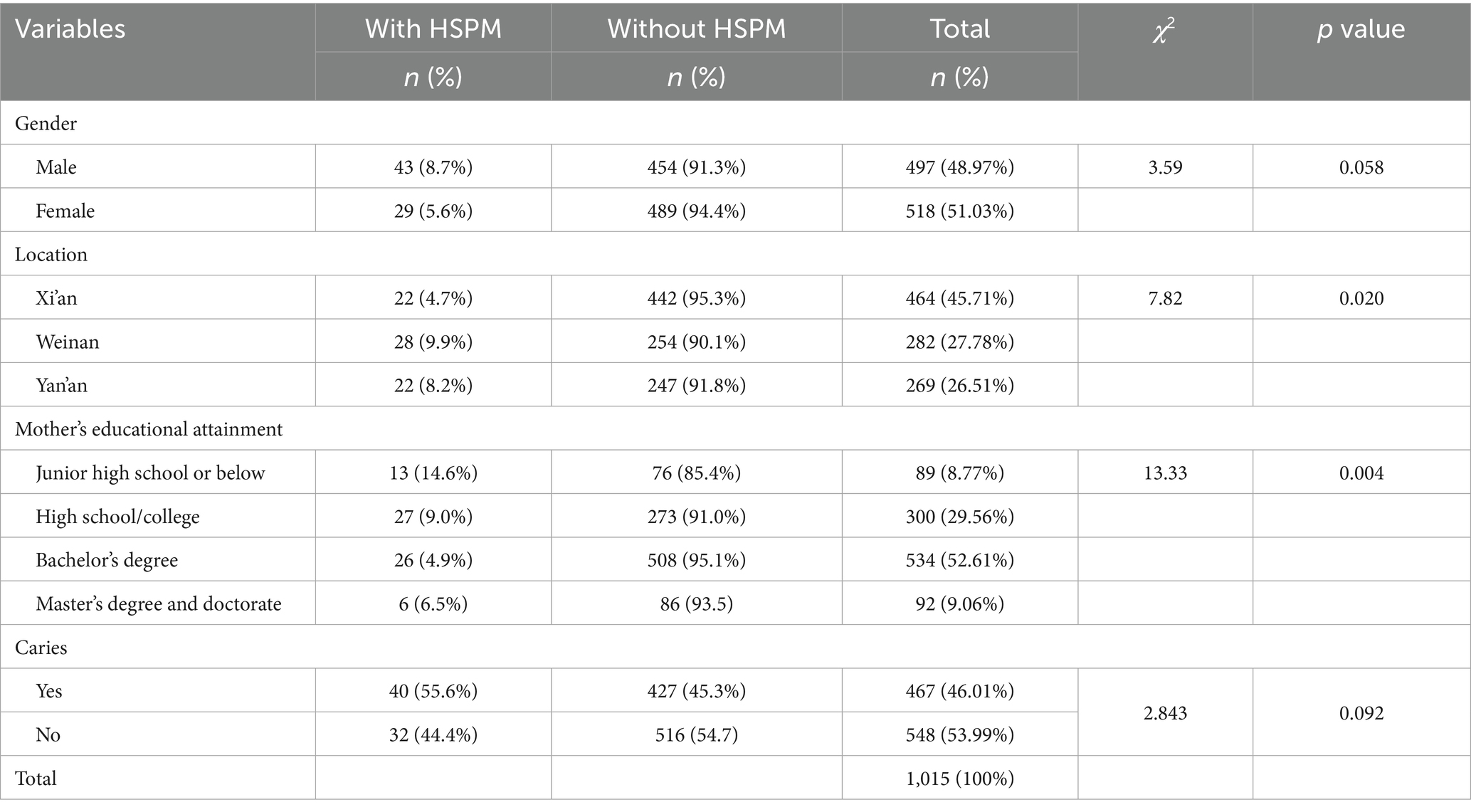 A total of 1,015 3–5-year-old preschool children were included, with 48.97% (497) males and 51.03% (518) females. Geographically, 45.71% (464) were from Xi’an, 27.78% (282) from Weinan, and 26.51% (269) from Yan’an. The overall HSPM prevalence was 7.09% (72/1015), with higher rates in males (8.70%) than females (5.60%) and lower rates in Xi’an (4.70%) than Weinan (9.90%) and Yan’an (8.20%). Maternal education was associated with HSPM, with prevalence decreasing from 14.6% (junior high or below) to 4.9% (bachelor’s degree) (see Table 1).