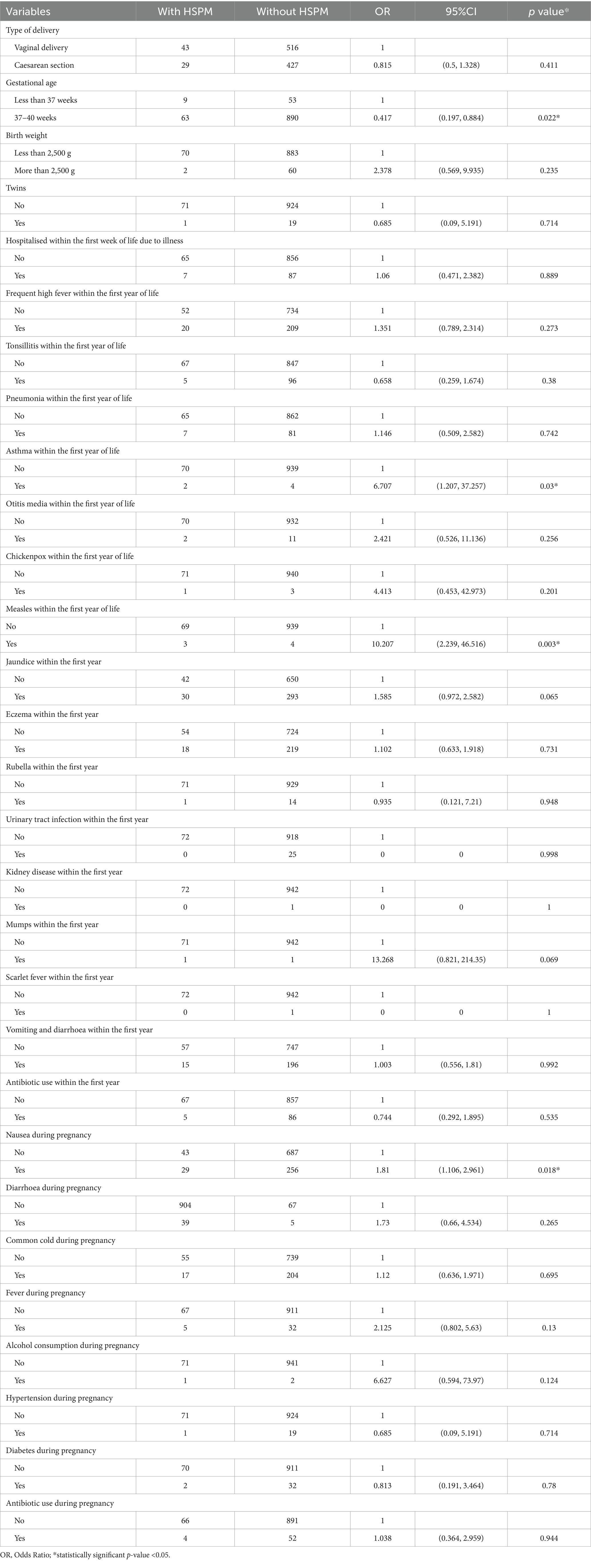 Table 2 shows the univariate regression results for the association between HSPM and prenatal, perinatal, and postnatal variables. HSPM was associated with gestational age (p = 0.022), asthma in the first year of life (p = 0.03), measles (p = 0.003), jaundice (p = 0.065), maternal nausea during pregnancy (p = 0.018), fever during pregnancy (p = 0.13), and alcohol consumption during pregnancy (p = 0.124). No significant associations were found with mode of delivery, birth weight, other diseases within the first year, antibiotic use, or maternal factors such as diarrhoea, colds, antibiotic use, hypertension, and diabetes during pregnancy.