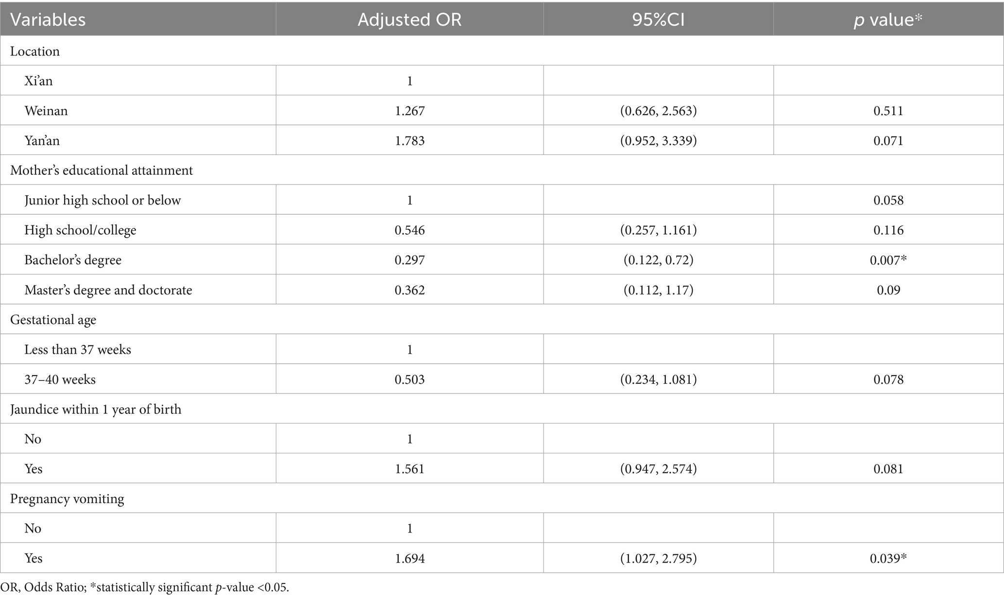 After excluding variables with weak associations (p > 0.2), five factors (birthplace, maternal education, gestational age, jaundice history, pregnancy vomiting) were included in the final model. Results showed maternal education (bachelor’s degree: OR = 0.297, 95% CI: 0.122–0.72) and pregnancy vomiting (OR = 1.694, 95% CI: 1.027–2.79) were independently associated with HSPM, while birthplace, gestational age, and jaundice history were not (Table 3). Variables with small positive case numbers (asthma, measles, pregnancy fever, alcohol consumption) were excluded from multivariable regression to avoid model divergence/large standard errors, though this may introduce selection bias (discussed in Limitations).
