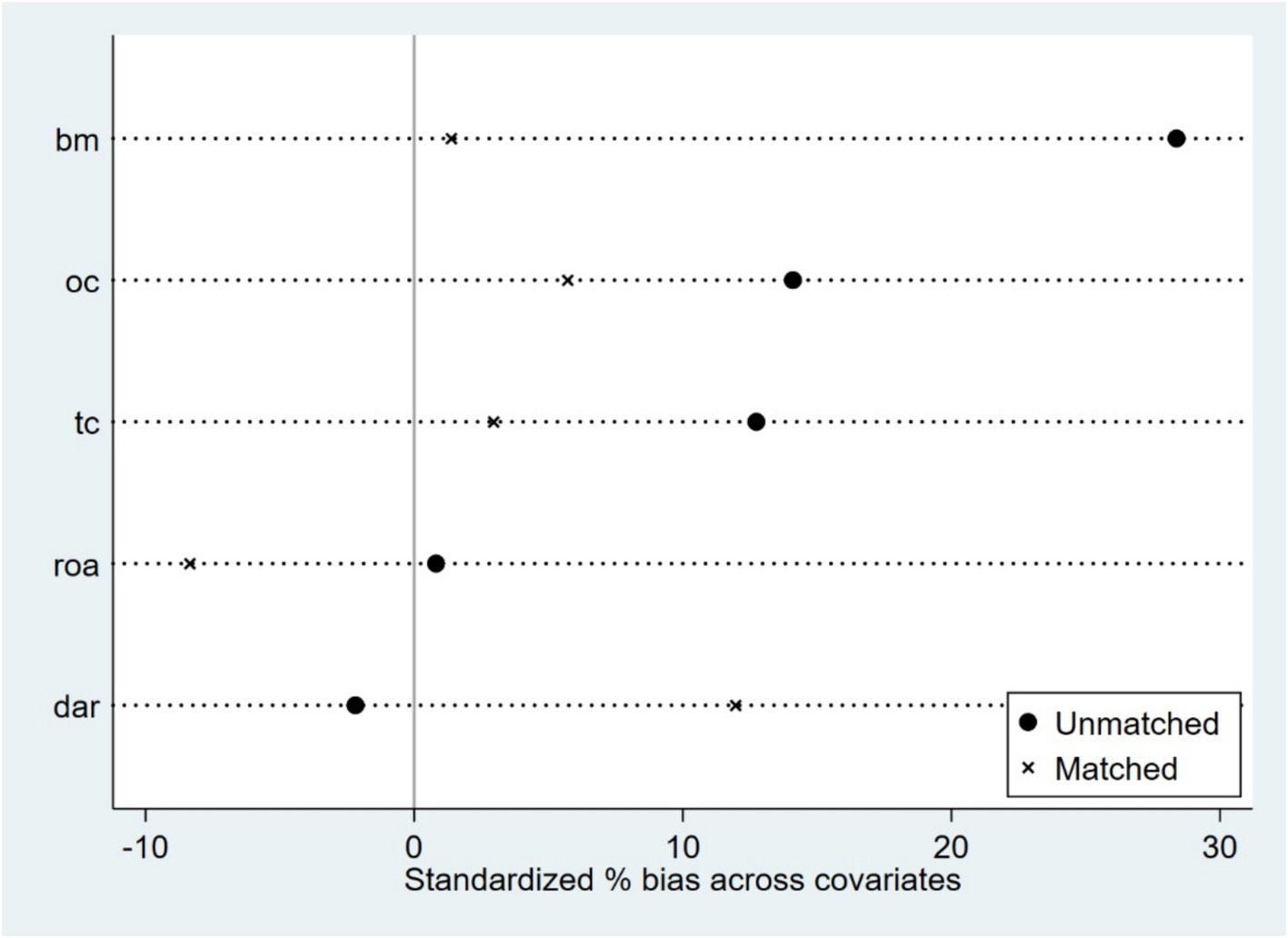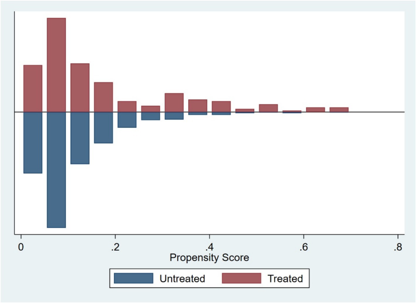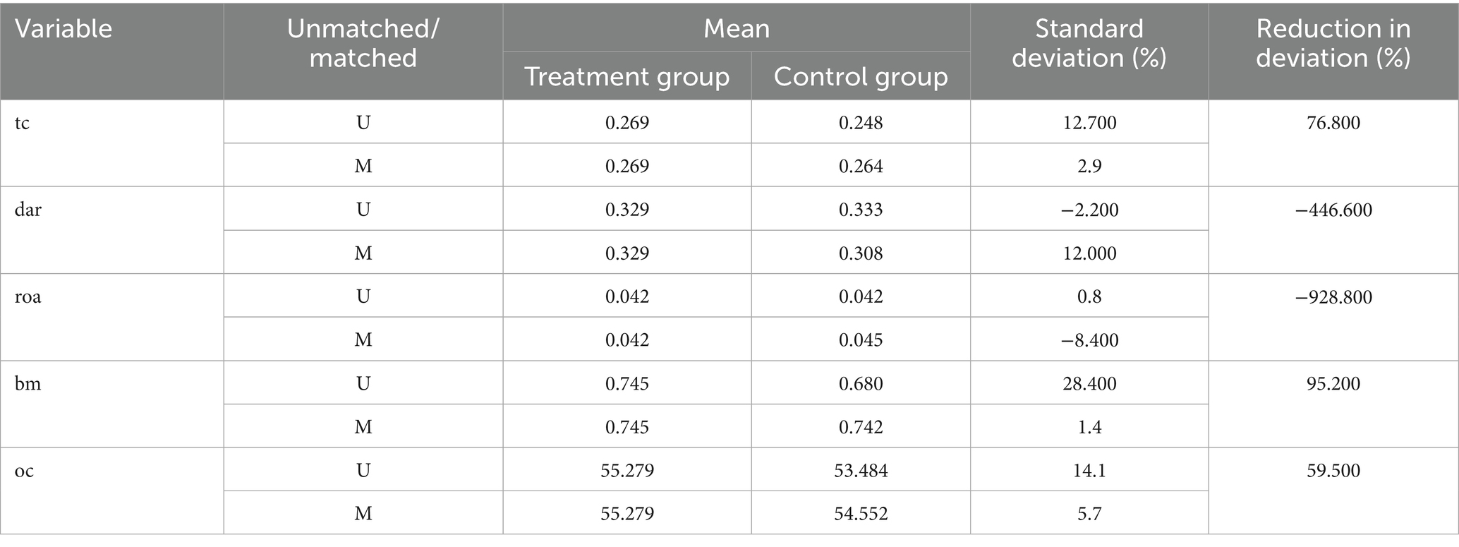 Although the DID model used earlier mitigates the endogeneity issue between policy implementation and firm innovation investment to some extent, it does not fully account for potential sample selection bias. Due to significant heterogeneity among firms in terms of size, financial conditions, and governance structures, the likelihood of firms being selected into the NDPN policy is not entirely random. This may lead to systematic pre-treatment differences between the treatment and control groups prior to policy implementation, thereby affecting the validity of DID estimates. To address this issue, this study further introduces the propensity score matching (PSM) method and constructs a PSM-DID model. By matching treatment and control groups with similar characteristics, the PSM-DID model aims to eliminate sample selection bias as much as possible while controlling for unobservable, time-invariant firm heterogeneity. This approach enables a more precise estimation of the net effect of the NDPN policy.