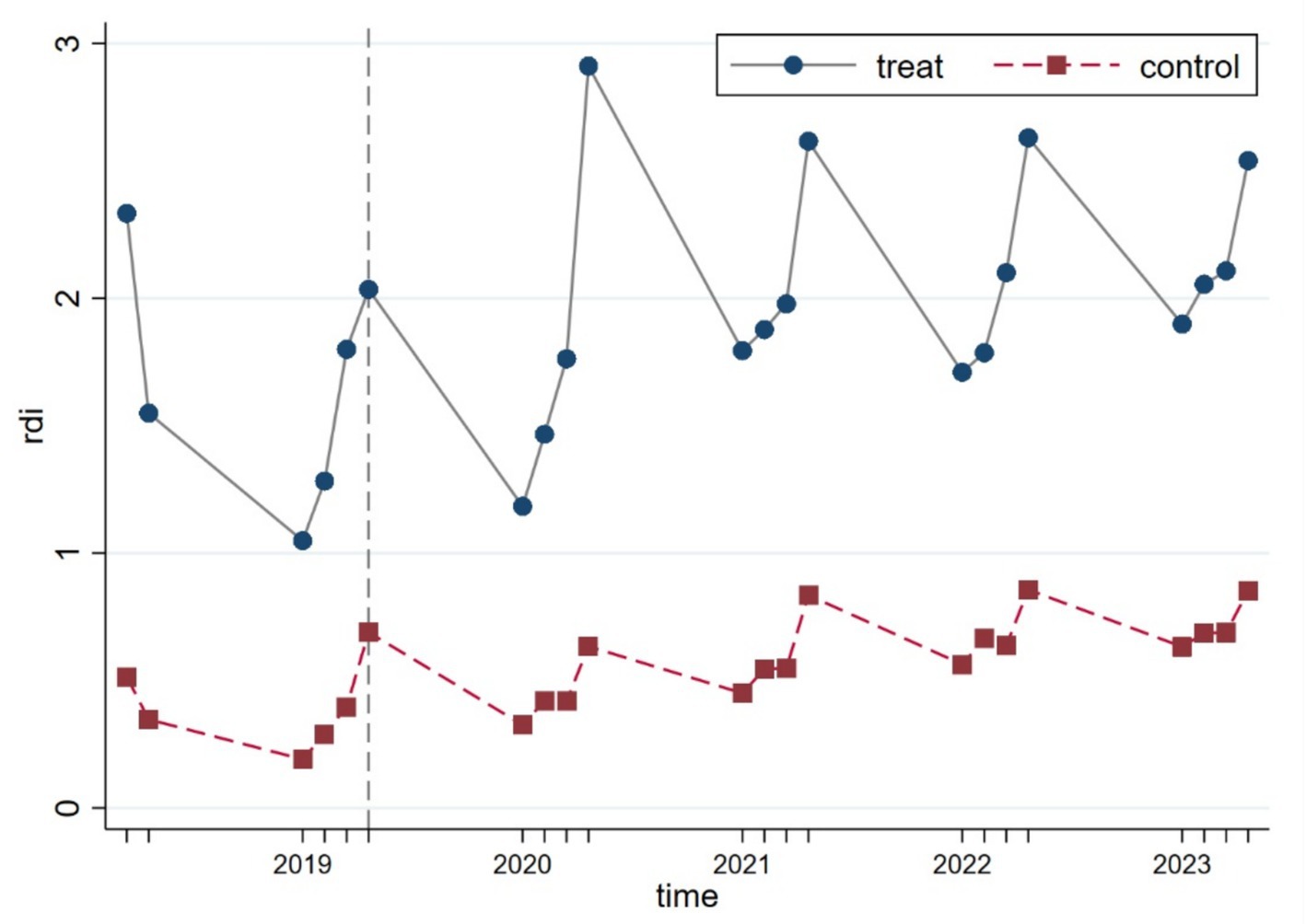 To verify whether the parallel trend assumption underlying the DID model holds, we conducted a visual inspection using the continuous linear variable R&D investment (rdi). As illustrated in Figure 3, the results show that prior to the policy implementation, the treatment and control groups exhibited similar trajectories, with no significant structural deviations observed, thus supporting the validity of the parallel trend assumption.