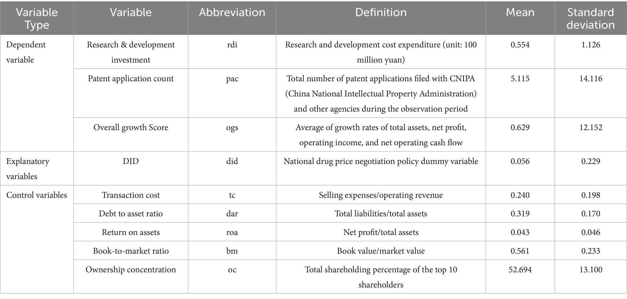 1. Following the studies of Sun et al. (9) and Li et al. (11), the dependent variables in this paper include: R&D investment of biopharmaceutical firms, the number of patent applications, used as a proxy for R&D output, and the overall growth score of biopharmaceutical firms. Compared with previous studies, this approach more reasonably and comprehensively reflects the impact of NDPN policy on corporate innovation.