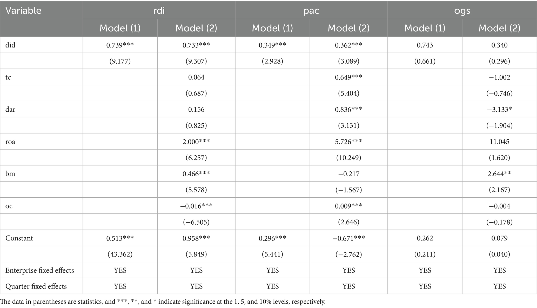 Subsequently, a DID regression analysis was conducted using the matched sample (Table 4). The core results indicate that the policy has a significant promotional effect on R&D investment (rdi) and patent application count (pac), consistent with the direction of the baseline DID results; and overall growth score (ogs) was not significantly affected.