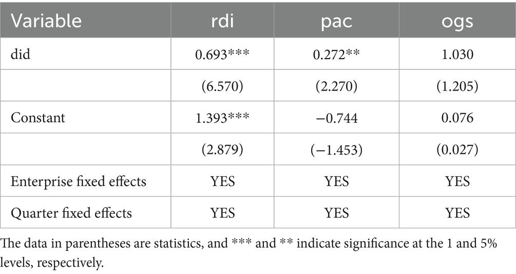 The results show that the coefficient of the DID variable is 0.739 (in 100 million RMB) when R&D investment (rdi) is used as the dependent variable, and is statistically significant at the 1% level. This indicates that firms participating in the NDPN policy exhibit substantially higher R&D expenditure than non-participating firms, demonstrating the policy’s strong incentive effect. The DID coefficient in Model (2) remains statistically significant at the 1% level, validating the robustness of the policy’s impact.