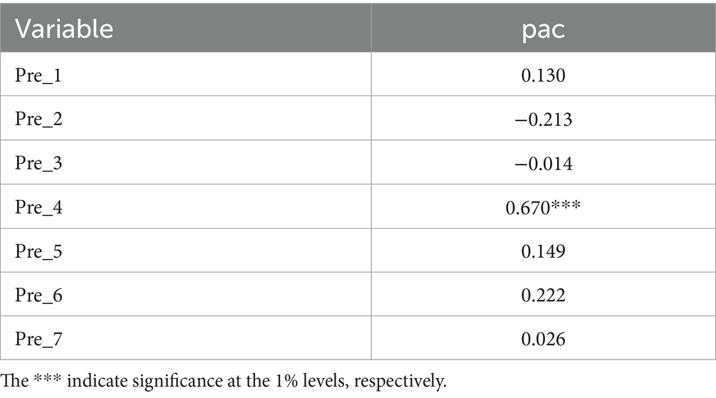 For the pac variable, due to the large number of zero values and the presence of extreme outliers in the sample, graphical parallel trend tests are likely to be unreliable. Following the approach in prior literature (22), parallel trend tests were conducted using a regression form.
