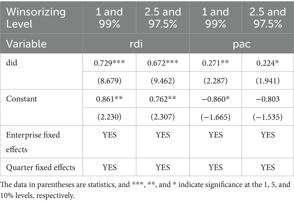 To mitigate the impact of outliers on the research results, this study followed the research methods of Zhao et al. (23) Specifically, the dependent variables were winsorized at the top and bottom 1 and 2.5% quantiles for all continuous variables, and then reintroduced into Model (2) for regression. The regression results are reported in Table 6. The results indicate that the estimated coefficients of the core explanatory variable DID remain significantly positive, supporting the hypothesis that the NDPN policy enhances the innovation performance of biopharmaceutical firms.